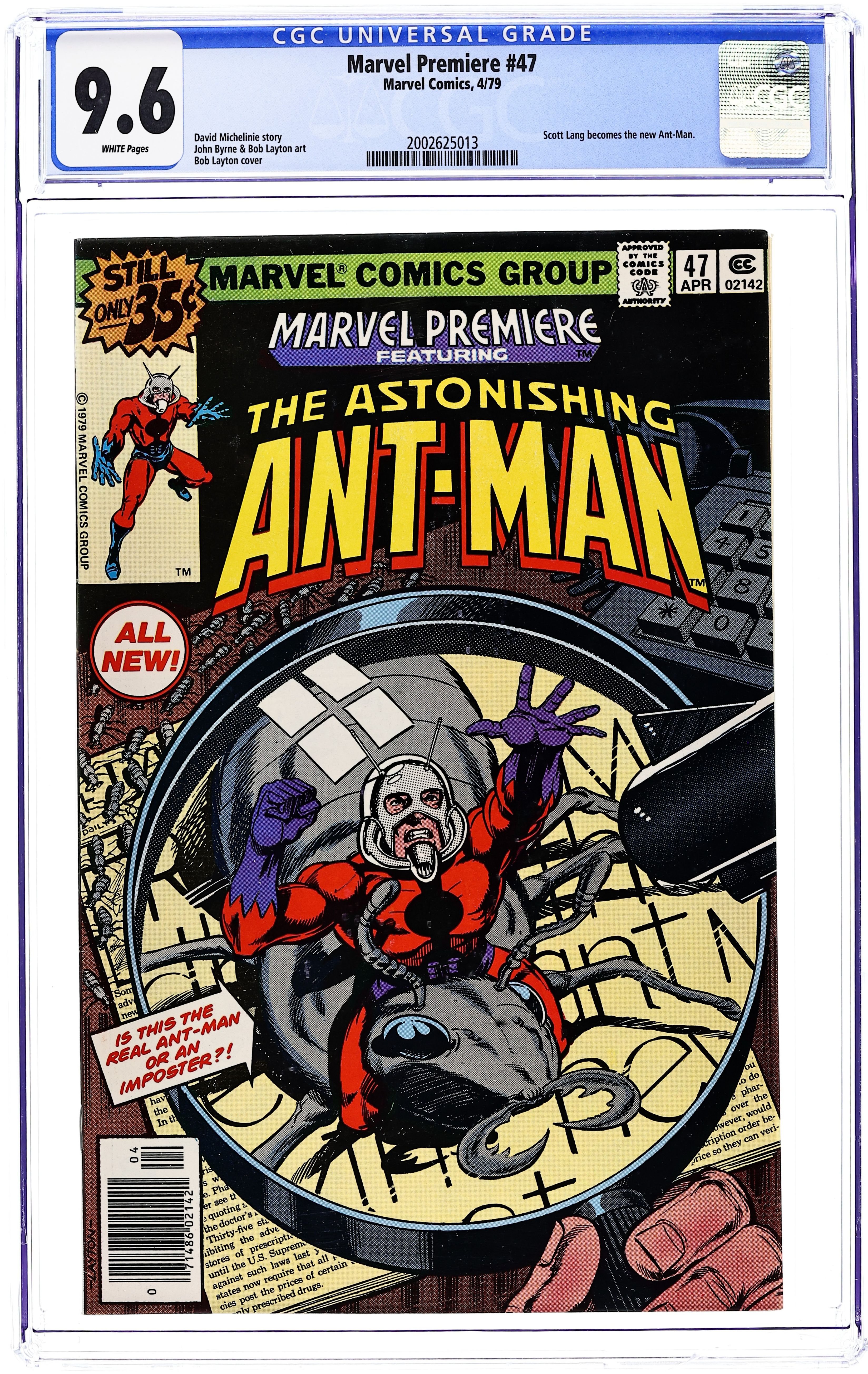 Starts Mar 16 Cover art by Bob Layton. First Scott Lang as Ant-Man in "To Steal An Ant-Man!", script by David Michelinie, pencils by John Byrne (breakdowns) and Bob Layton (finished art), inks by Bob Layton; What happens when Scott Lang, former electrician to the Avengers, steals Hank Pym's shrinking particles?; And why has this ex-con reverted back to his thieving ways?; Check out Scott Lang, Ant-Man, suited up for the first time! 36 pgs., full color. Cover price $0.35. Grade: CGC 9.6 explanation of grade Condition: Used (collectible)
