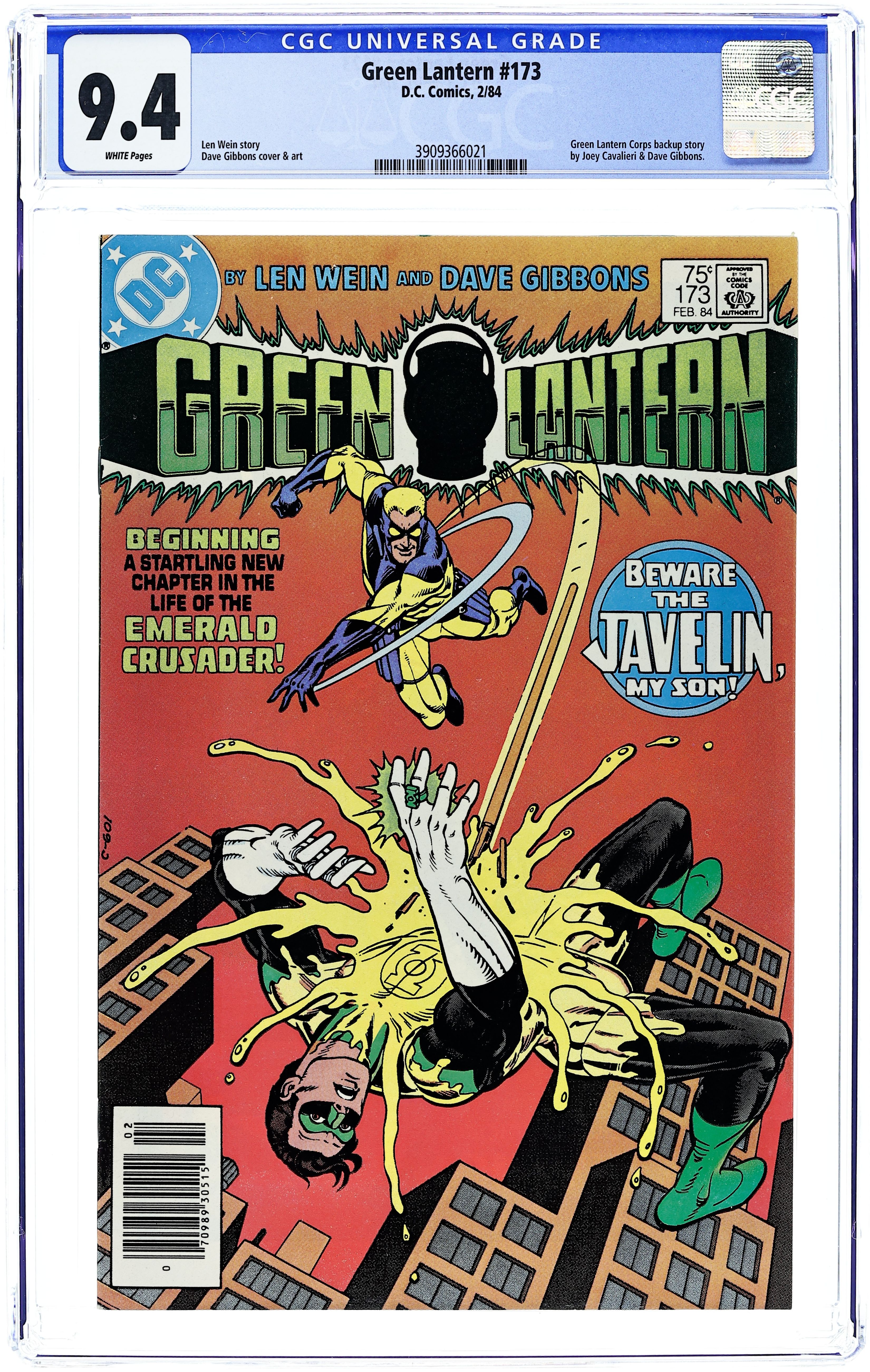 Starts Mar 16 1st appearance of Javelin - "Old Friends, New Foes." The Javelin has been hired to take down Ferris Aircraft, and Green Lantern must intervene. The Monitor and Lyla make guest appearances. Script by Len Wein, art by Dave Gibbons. "Progress." A Green Lantern killed in action passes his ring on to a primitive. Script by Joey Cavalieri, art by Gibbons. Cover by Gibbons. Cover price $0.75. Grade: CGC 9.4 explanation of grade Condition: Used (collectible)
