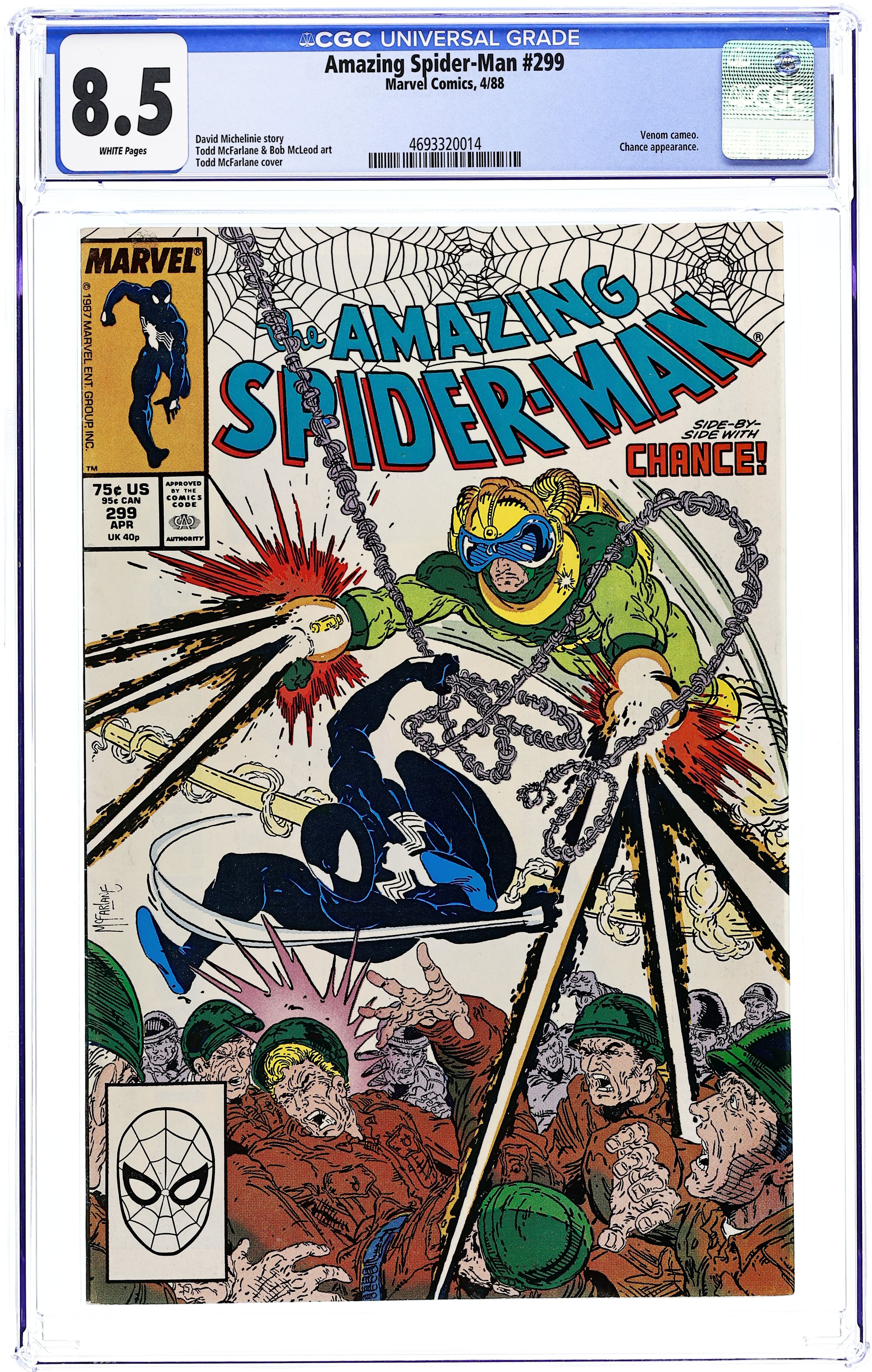 Direct Edition. "Survival of the Hittist!" Part 2 of 2. Script by David Michelinie. Pencils by Todd McFarlane. Inks by Bob McLeod. Cover by Todd McFarlane. After their waterfront arms theft goes awry, the Life Foundation turns the tables on Chance! The mysterious survivalist group abducts the mercenary and takes him to their secret headquarters in northern New Jersey! But thanks to a well-placed spider tracer, the web-slinger infiltrates the foundation's secluded colony the next day...and rescues Chance! So now the adversaries of 24 hours ago suddenly become allies to avoid death...courtesy of the Life Foundation! First appearance (and cameo on the last page) by Venom. Cameo appearances by Eddie Murphy, Paul Schaffer, and Joe Robertson. Last 75ยข issue. 36 pages, full color. (Note: Chance returns in Amazing Spider-Man 336.) Cover price $0.75. Grade: CGC 8.5 explanation of grade Condition: Used (collectible)