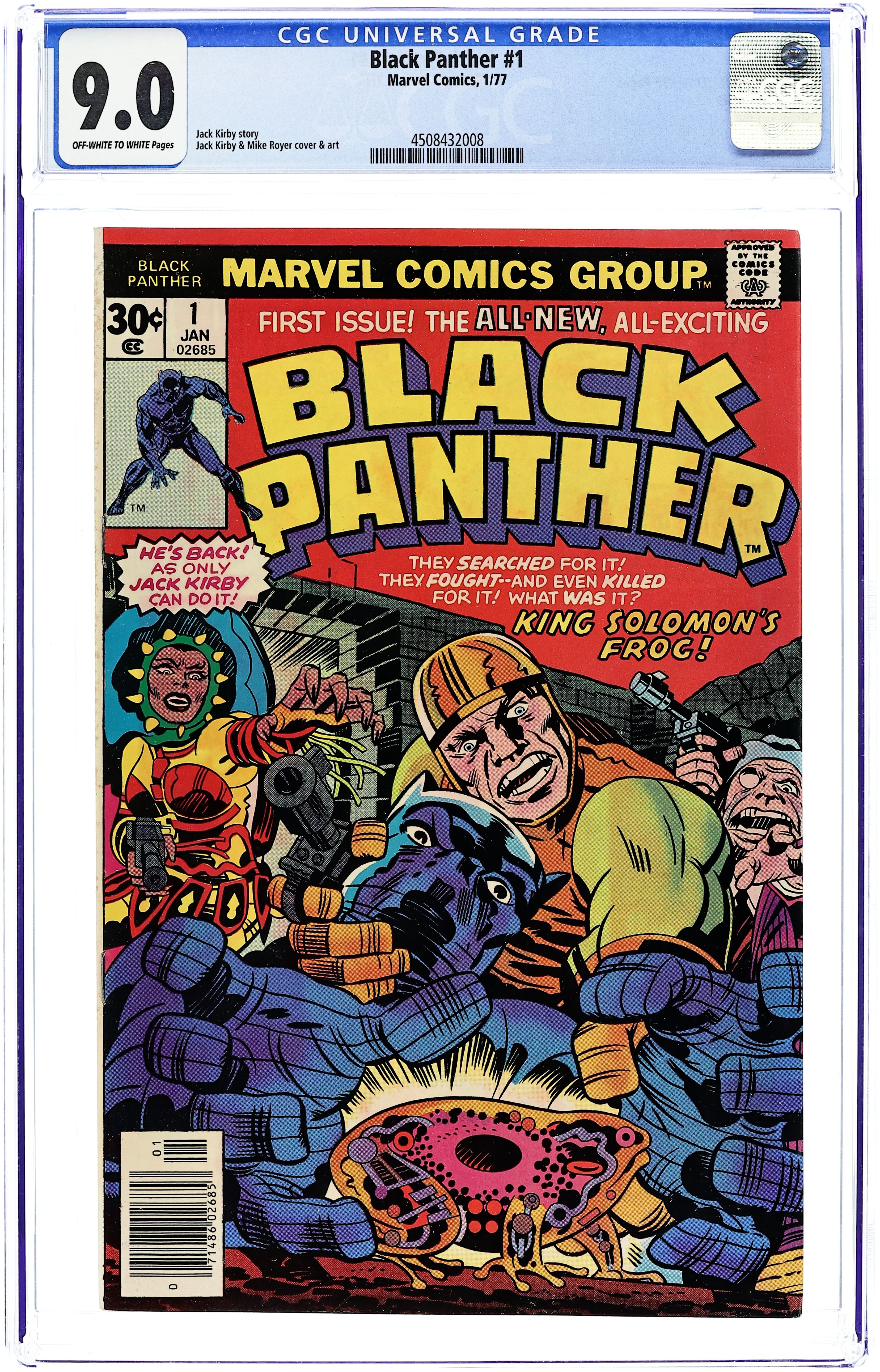 Starts Mar 23 Cover pencils by Jack Kirby, inks by John Verpoorten. King Solomon's Frog!, script and pencils by Jack Kirby, inks by Mike Royer; Black Panther helps Abner Little, a member of the Collectors, recover the Brass Frog, an ancient time machine; Due to its dangerous nature, the Frog had previously been hidden away by the Black Panther's grandfather, Azzuri, but was taken by Alfred Queely, a fellow member of the Collectors; After getting the Frog, the Black Panther and Little are attacked by Princess Zanda, another member of the Collectors, for control of the artifact. During the battle, the Frog is activated and a mysterious creature, Hatch-22, appears. Jack Kirby writes about what readers can expect from his new Black Panther. 36 pgs. $0.30. Cover price $0.30. Grade: CGC 9.0 explanation of grade Condition: Used (collectible)