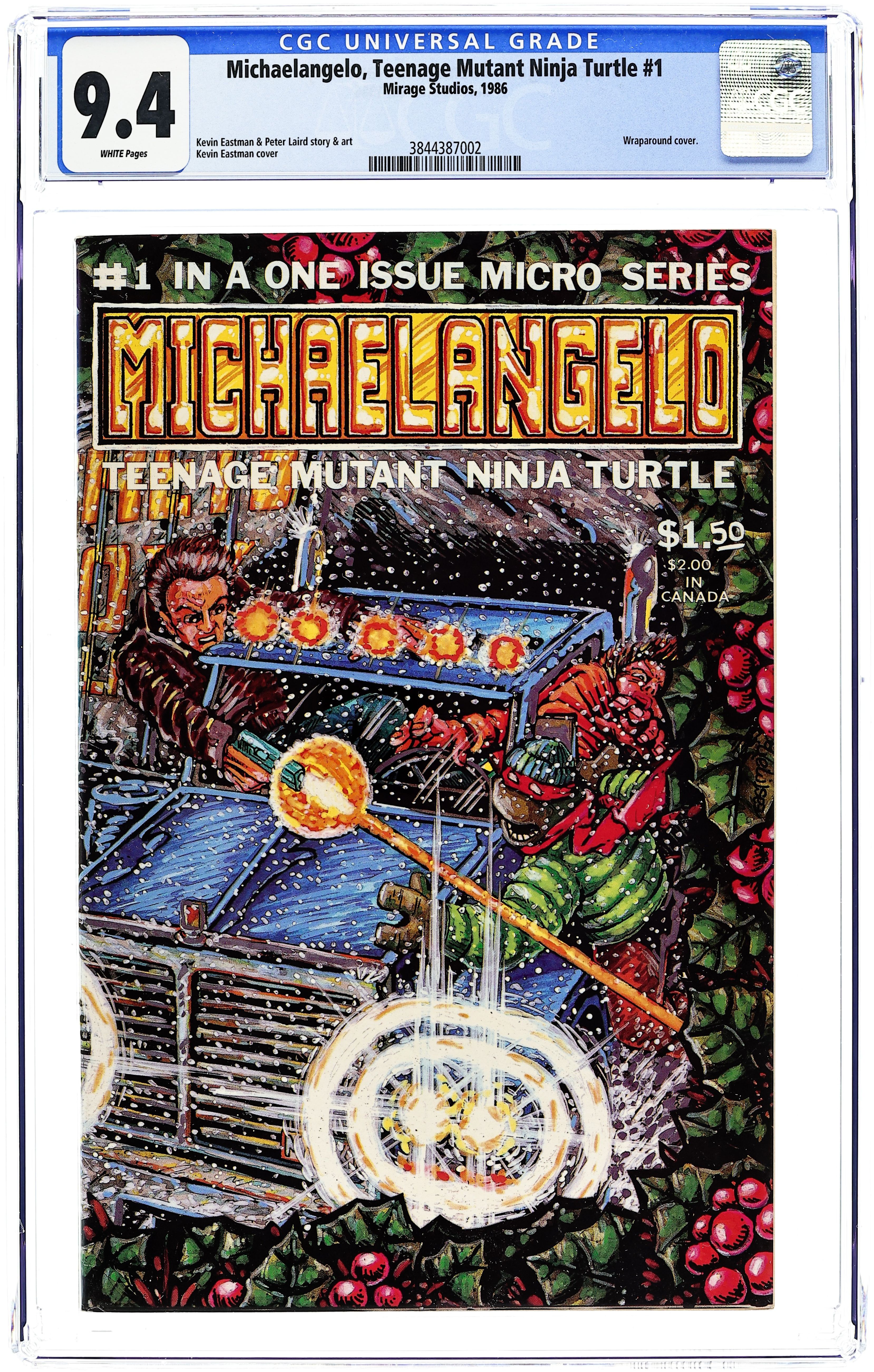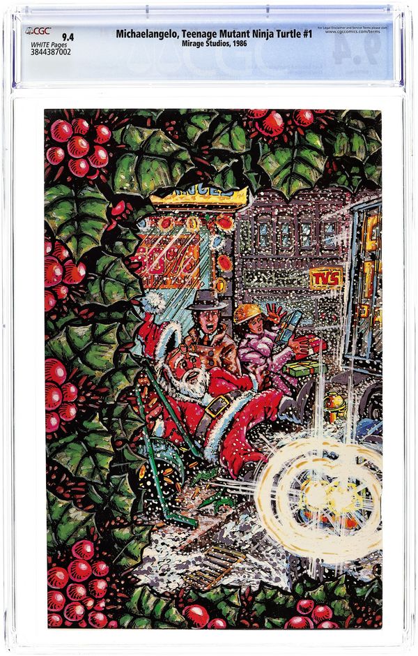 Starts Mar 23 Michaelangelo of the Teenage Mutant Ninja Turtles has a solo Christmas adventure, as he battles hoodlums who have hijacked a truck full of toys intended for an orphanage. Part of a series of one-shots featuring the Turtles in solo stories. Story and art by Kevin Eastman and Peter Laird. Backup story featuring Gizmo; story and art by Michael Dooley. Black and white; 44 pages. Wraparound cover by Eastman. Cover price $1.50. Cover price $1.50. Grade: CGC 9.4 explanation of grade Condition: Used (collectible)