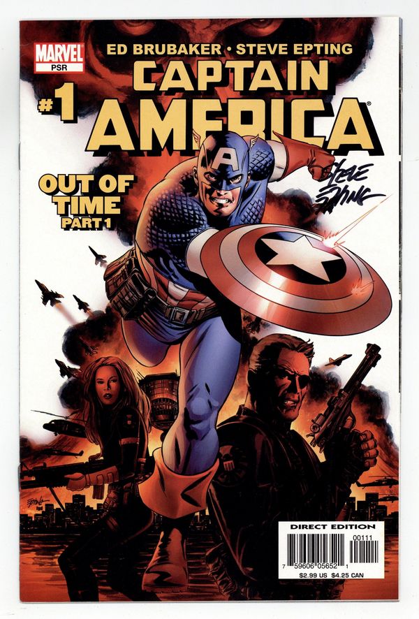 Starts Mar 23 1st cameo app. of Winter Soldier. Winter Soldier: Part 1.1 - Out of Time: Part 1 of 6 - Written by ED BRUBAKER Art & Cover by STEVE EPTING It's a new beginning as four-time Eisner-nominated Best Writer Ed Brubaker makes his Marvel debut, joined by white-hot artist Steve Epting! As the new regular creative team, they will take Cap's life in directions fans will never see coming! In just this first issue, the Red Skull lays the groundwork for his most devastating attack ever on Captain America and the land he holds dear...and with the Cosmic Cube in his possession, how can Cap hope to stop him? Find out in the shocking twist-ending that will have everybody in the industry talking! 32 PGS./ MARVEL PSR NOTE: First partial/Cameo appearance of Winter Soldier. First full appearance is in issue #6 Cover price $2.99. Grade: VF- 7.5 explanation of grade Condition: Used (collectible)
