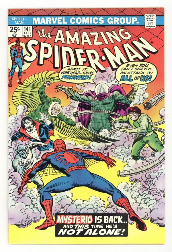 Starts Mar 23 First appearance of the second Mysterio (aka Danny Berkhart) in "The Man's Name Appears to Be...Mysterio!" Part 1 of 2. Script by Gerry Conway. Pencils by Ross Andru. Inks by Frank Giacoia and Dave Hunt (backgrounds). Cover by John Romita. The Amazing Spider-Man decides to take the Spider-Mobile for a spin! But after evading New York's Finest, he accidentally crashes into the Hudson River! Scratch one Spider-Mobile! The mist and fog tricked the web-slinger! The next day when the wall-crawler sees apparitions on his deadly foes including the Green Goblin, Dr. Octopus, and the Molten Man; he realizes that the Master of Illusion has returned! Can Spider-Man stop the madness...before he goes mad himself? Cameo appearances by Mary Jane Watson, Betty Brant, Ned Leeds, Joe Robertson, J. Jonah Jameson, and Professor Miles Warren. (Notes: The web-slinger previously battled the original Mysterio in Amazing Spider-Man 67. The letters page includes Marvel Value Stamp series A #35 Killraven by Herb Trimpe and Frank Giacoia. This story was reprinted in Marvel Tales 118.) 36 pages. 25c cover price. Cover price $0.25. Grade: FN+ 6.5 explanation of grade Condition: Used (collectible)