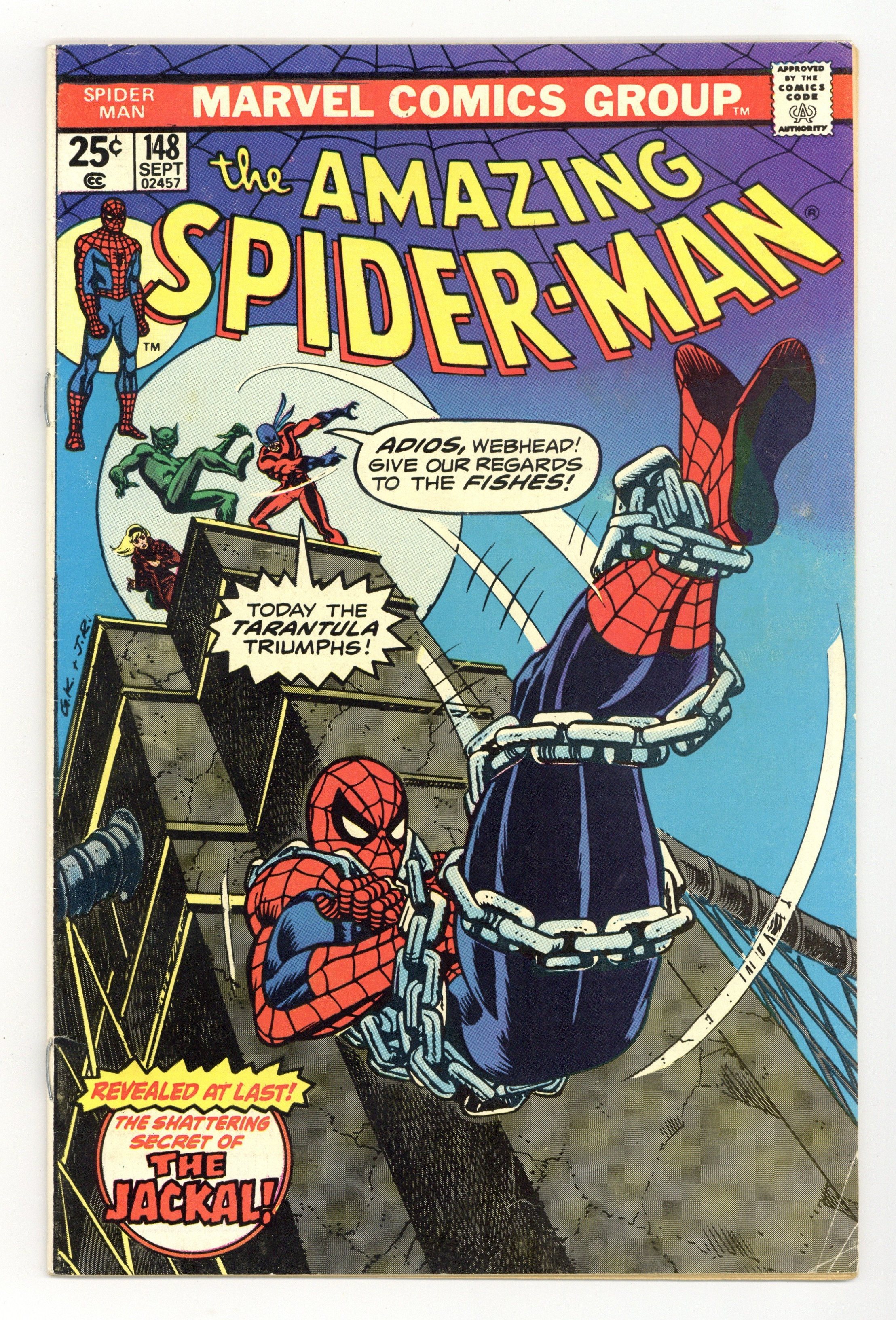 Starts Mar 16 "Jackal, Jackal...Who's Got the Jackal?" Script by Gerry Conway. Pencils by Ross Andru. Inks by Mike Esposito and Dave Hunt (backgrounds). Cover by Gil Kane and John Romita Sr. As shown on the fateful cover, the Tarantula throws the shackled web-slinger off the top of the Brooklyn Bridge! Can the amazing one stop his freefall before slamming into the East River? If not, poor Spidey will sleep with the fishes and never learn the truth behind Gwen's return. Meanwhile at the Daily Bugle, Ned Leeds finally connects the dots about the Gwen Stacy clone! Apparently, Gwen once donated cell tissue samples in Professor Miles Warren's biology class at Empire State University! Hmmm, has the good professor been playing god in his spare time? All will be revealed next issue! Cameo appearance by Mary Jane Watson. Flashback cameos by Anthony Serba and Gwen Stacy. (Note: The letters page includes a letter from Eclipse comics publisher Dean Mullaney. This story was reprinted in Marvel Tales 125.) 36 pages. 25c cover price. Cover price $0.25. Grade: VG/FN 5.0 explanation of grade Condition: Used (collectible)