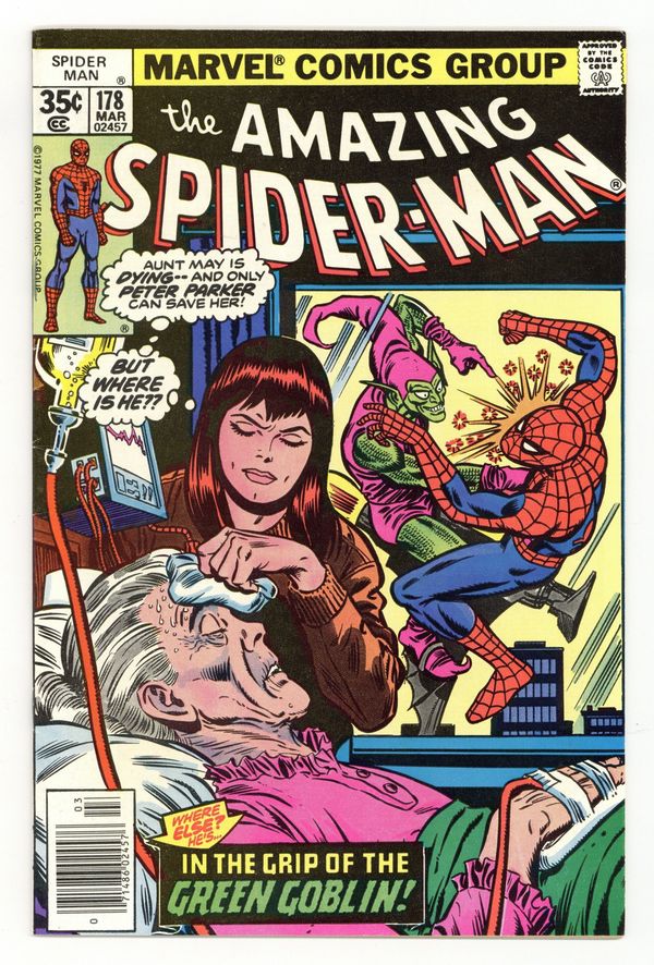 Starts Mar 16 The"Green Grows the Goblin!" Part 3 of 5. Script by Len Wein. Art by Ross Andru (breakdowns) and Jim Mooney (finishes). Cover by Ross Andru and Joe Sinnott. If a picture is worth a thousand words, then the frantic cover says it all! Aunt May lies near death in her hospital bed awaiting life-saving surgery! But the doctors can't operate until her next of kin (aka the wondrous wall-crawler) signs the consent forms! Oh no! Where is the web-slinger? Currently fighting for his own life vs. the Green Goblin! It's a painful predicament in more ways than one for the Spectacular Spider-Man! Cameo appearances by Silvermane, Glory Grant, Joe Robertson, J. Jonah Jameson, Anna Watson, and Harry Osborn. (Note: The letters page includes a statement of ownership: average print run 587,702; average paid circulation 281,860.) 36 pages. Cover price $0.35. Grade: FN/VF 7.0 explanation of grade Condition: Used (collectible)