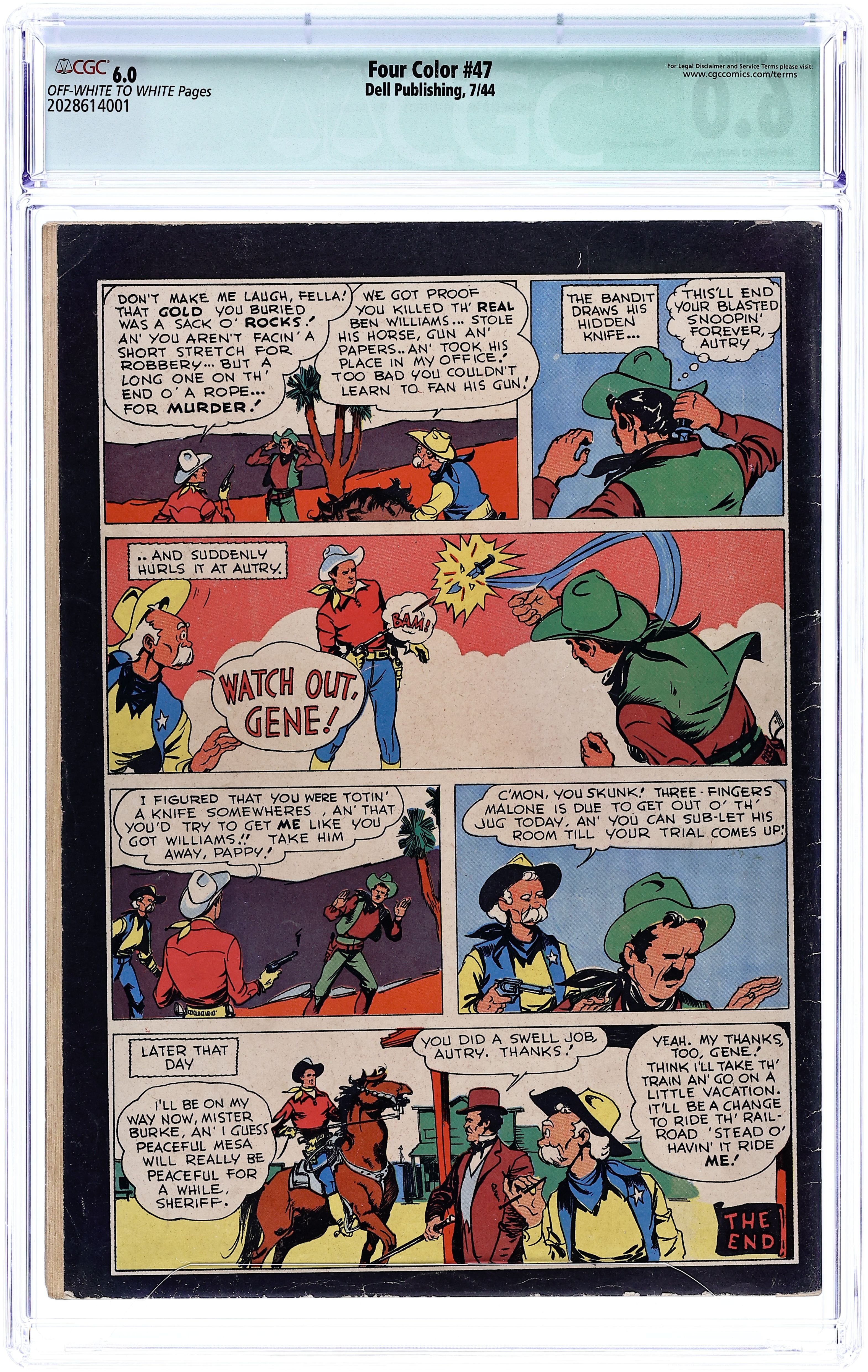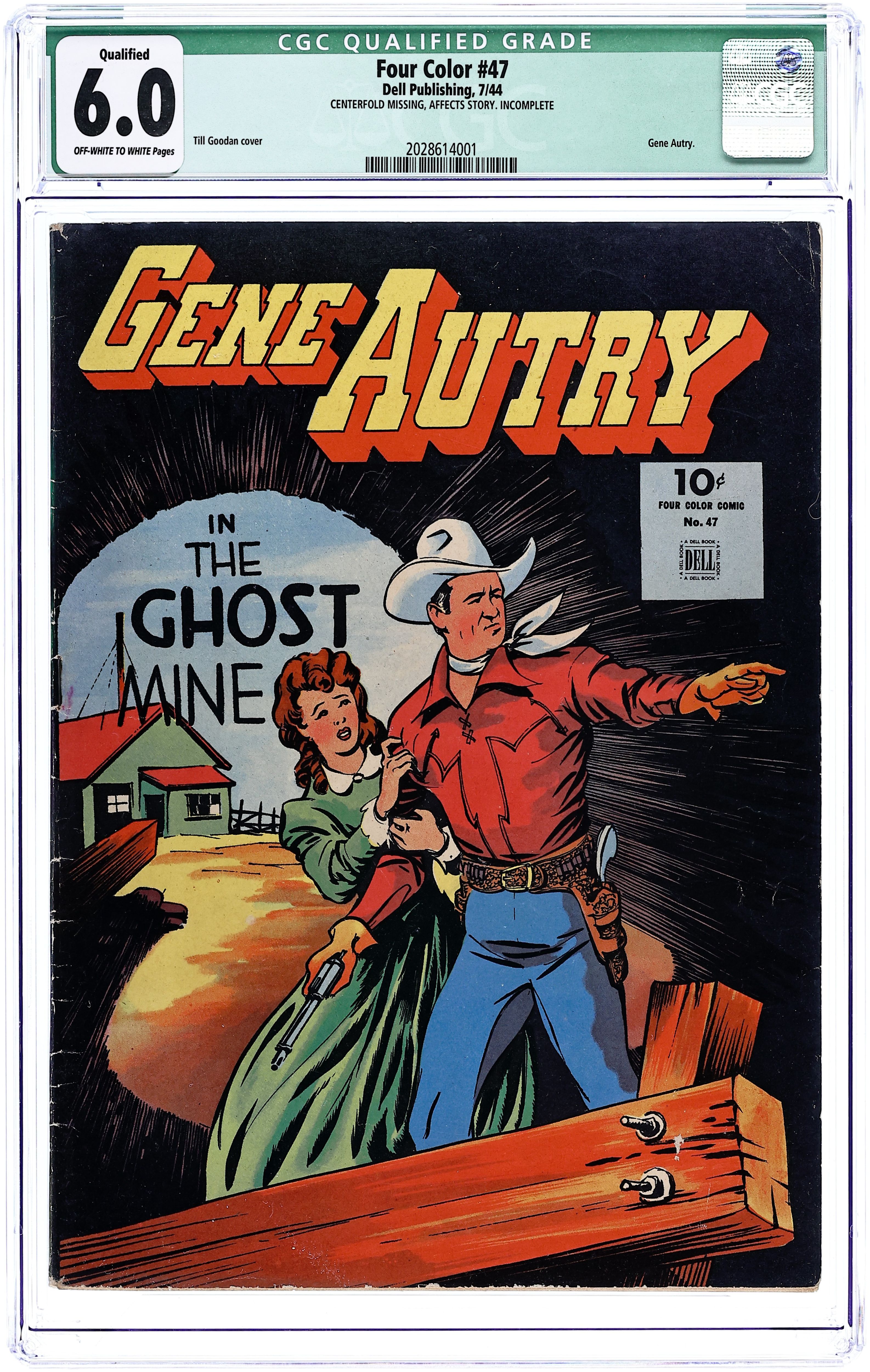 Starts Apr 4 Indicia title is "GENE AUTRY, No. 47." Cover art by Till Goodan. The Ghost Mine; Bill Drake has restarted the Ghost Canyon gold mine; He claims he bought it from Hank Nolan before he died, but Nolan's daughter Milly says he left the mine to her. Cowboy Lingo fact pages; definitions of cowboy slang terms. Renegade Ranch; Royal Rollins employs ex-cons from nearby Graystone Prison on his ranch. The Bandit of Dust Devil Gap; Anton Burke, a railroad official, calls on Gene for help in solving a series of train robberies that occur at night at a dusty pass. 60 pages, full color. Cover price $0.10. Grade: CGC 6.0 explanation of grade Condition: Used (collectible)