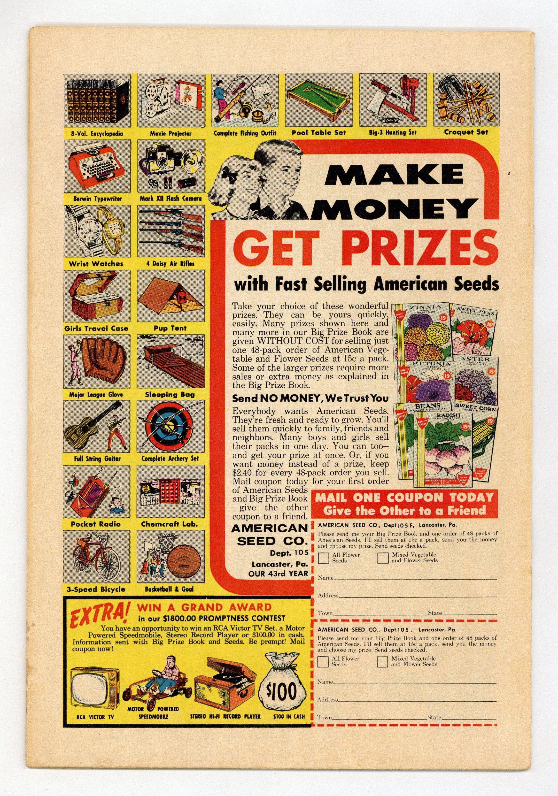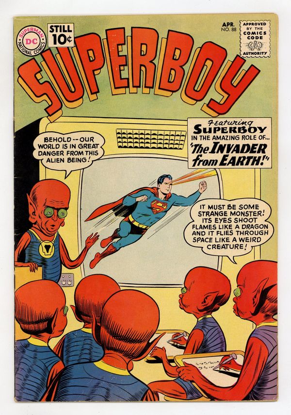 Cover pencils by Curt Swan, inks by Stan Kaye. "The Invader from Earth!", script by Robert Bernstein, art by Al Plastino; On an alien planet Superboy discovers a primitive race living on the outskirts of a super scientific city; He tries to help them but they won't listen to him because they think he's a monster. A Salute to Our American Indians! public service announcement, script by Jack Schiff, art by Bernard Baily. Peg humor page by Henry Boltinoff. Ad for Superman, Superman's Pal, Jimmy Olsen, and Superman's Girl Friend, Lois Lane. Ad for Justice League of America. "The One-Man Team!", art by George Papp; When Smallville suffers yet another crushing loss in a football game, the principal of Smallville High and the coach of their football team ask Superboy to go out for the team; Superboy demonstrates to the people of Smallville why he shouldn't be part of the team. "The Saddest Boy in Smallville!", art by George Papp; Clark Kent's classmate Tommy Hunter is ashamed that his father, James, is only a doorman at the Smallville Bijou, until James Hunter helps Superboy apprehend the ABC Gang. 36 Pages, Full Color. Cover price $0.10. Grade: VG/FN 5.0 explanation of grade Condition: Used (collectible)