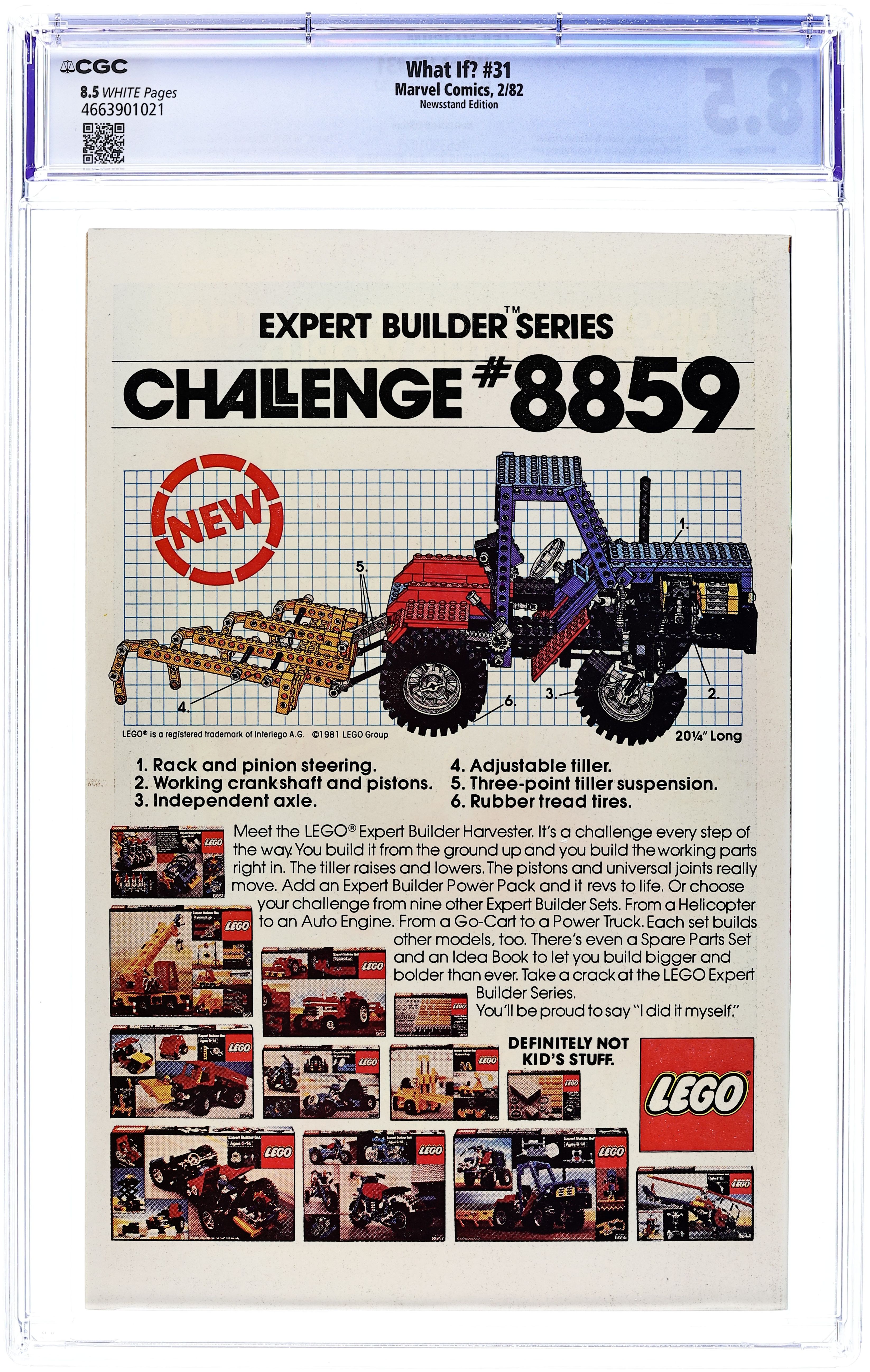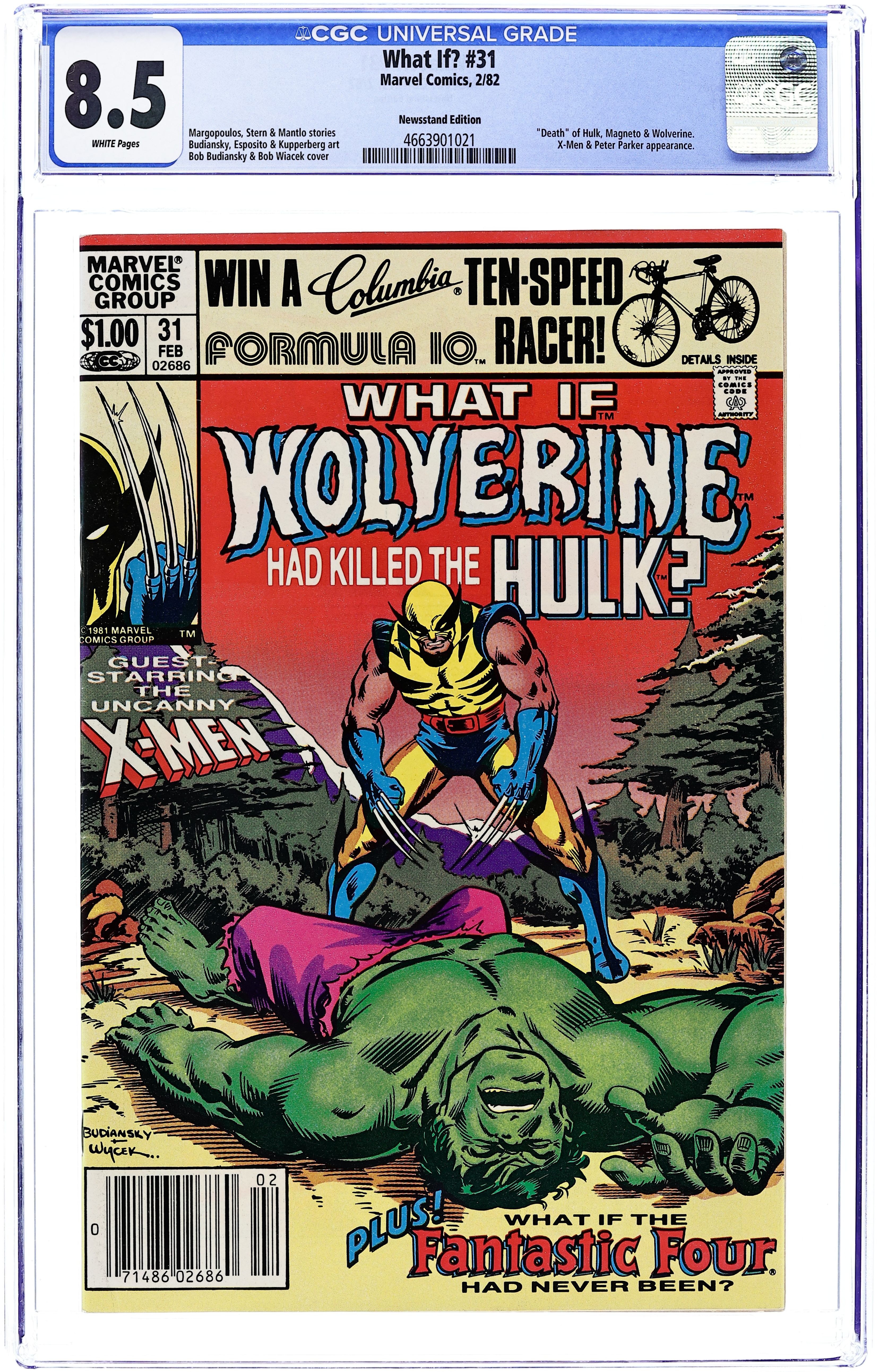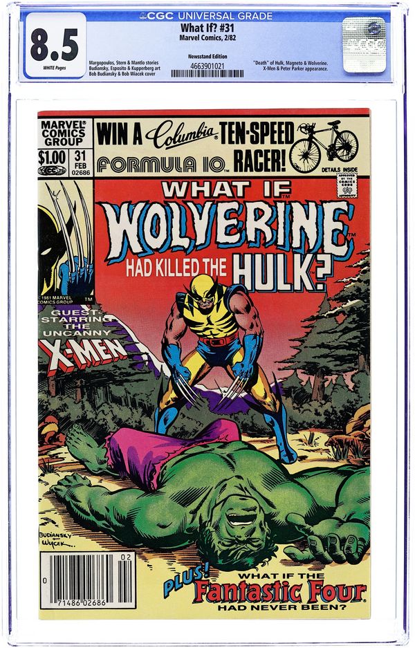 Newsstand Edition. Cover pencils by Bob Budiansky, inks by Bob Wiacek. "What If Wolverine Had Killed the Hulk?" Script by Rich Margopoulos, pencils by Bob Budiansky, inks by Mike Esposito; Wolverine kills the Hulk and joins Magneto's Brotherhood of Evil Mutants; Co-starring the X-Men, Magneto, and the Brotherhood of Evil Mutants; Cameos by Spider-Man, the Avengers, Daredevil, the Fantastic Four, and the Sentinels; Based on The Incredible Hulk #181. Dungeons & Dragons ad. "What If There Was No Fantastic Four?", script by Roger Stern (based on a plot by Bill Mantlo), pencils by Alan Kupperberg, inks by Frank Giacoia; The Thing never joins the team which has repercussions throughout the Marvel Universe. "Daredevil's Longest Fight!" ad for Hostess Fruit Pies. 52 pgs. Cover price $1.00. Grade: CGC 8.5 explanation of grade Condition: Used (collectible)