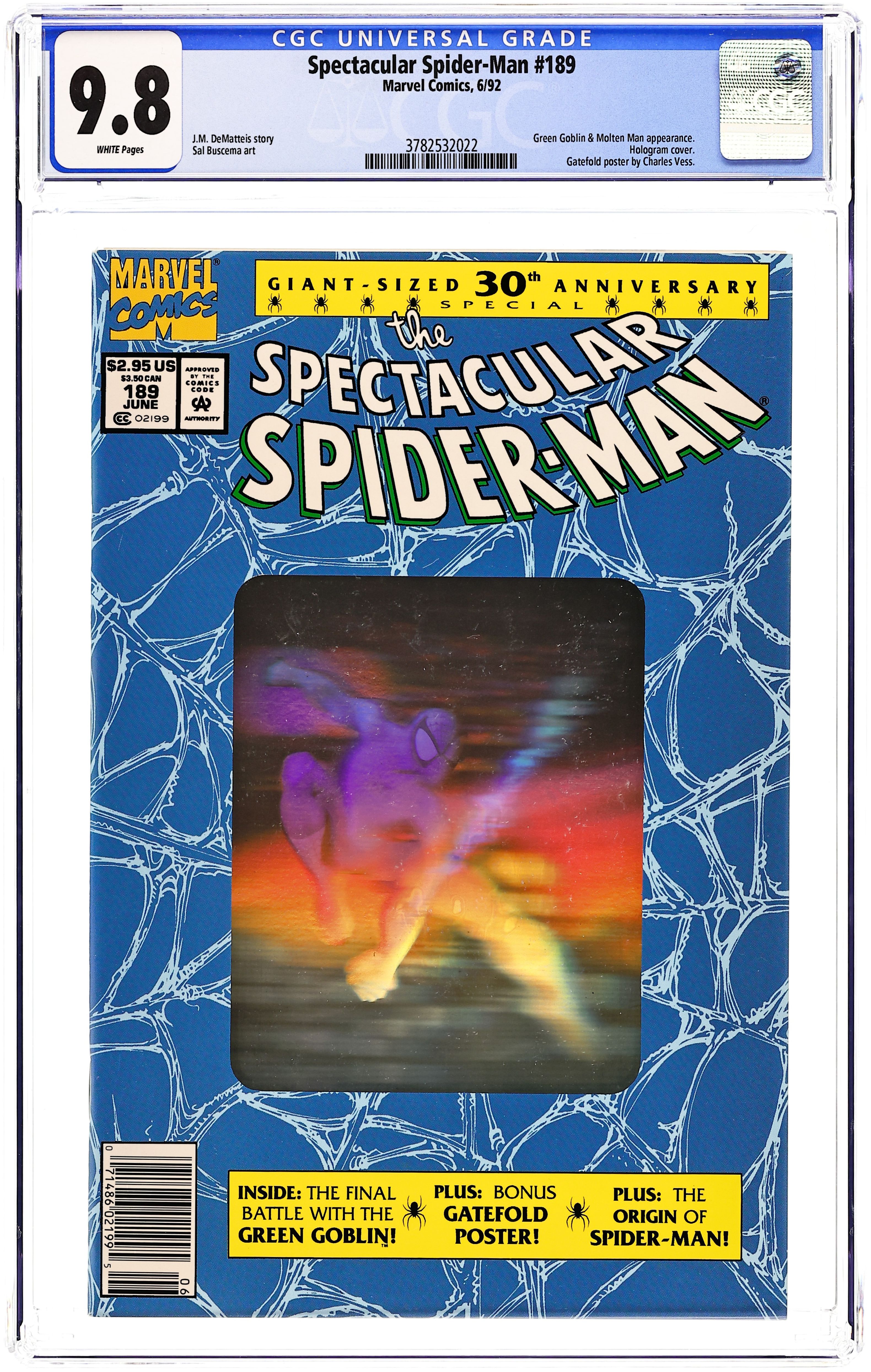Starts Apr 4 Newsstand Edition. The Osborn Legacy" First printing. Giant-Sized 30th Anniversary Special Issue. Silver hologram cover. Script by J.M. DeMatteis. Pencils and Inks by Sal Buscema. Harry Osborn has battled psychological problems his entire adult life, but this time hes really gone off the deep end! The Green Goblin kidnaps his wife, son, and brother-in-law (aka the Molten Man) and takes the trio to his fathers old house in the suburbs. For the first time Harry wears the goblin costume in front of his young son. However, Normie doesnt seems to understand the gravity or depravity of the situation and enjoys his fathers ranting and raving while the family sits down for dinner! Fortunately, the goblins diatribe buys the web-slinger time to track down his green and purple foe! And with help from the Molten Man, the Amazing Spider-Man battles the Green Goblin one more time! Second Story: The Night the World Died Script by J.M. DeMatteis. Pencils and Inks by Bob McLeod. Aunt May still has nightmares about the night her husband, Ben Parker, was killed. But her recent encounter with Spider-Man (during the ordeal with the Vulture) has surprisingly brought her comfort. (Notes: This issue includes a fold out poster by Charles Vess featuring Spider-Man and the Hobgoblin. The second printing has a gold hologram cover and was published in November 1992.) 48 pages Cover price $2.95. Grade: CGC 9.8 explanation of grade Condition: Used (collectible)