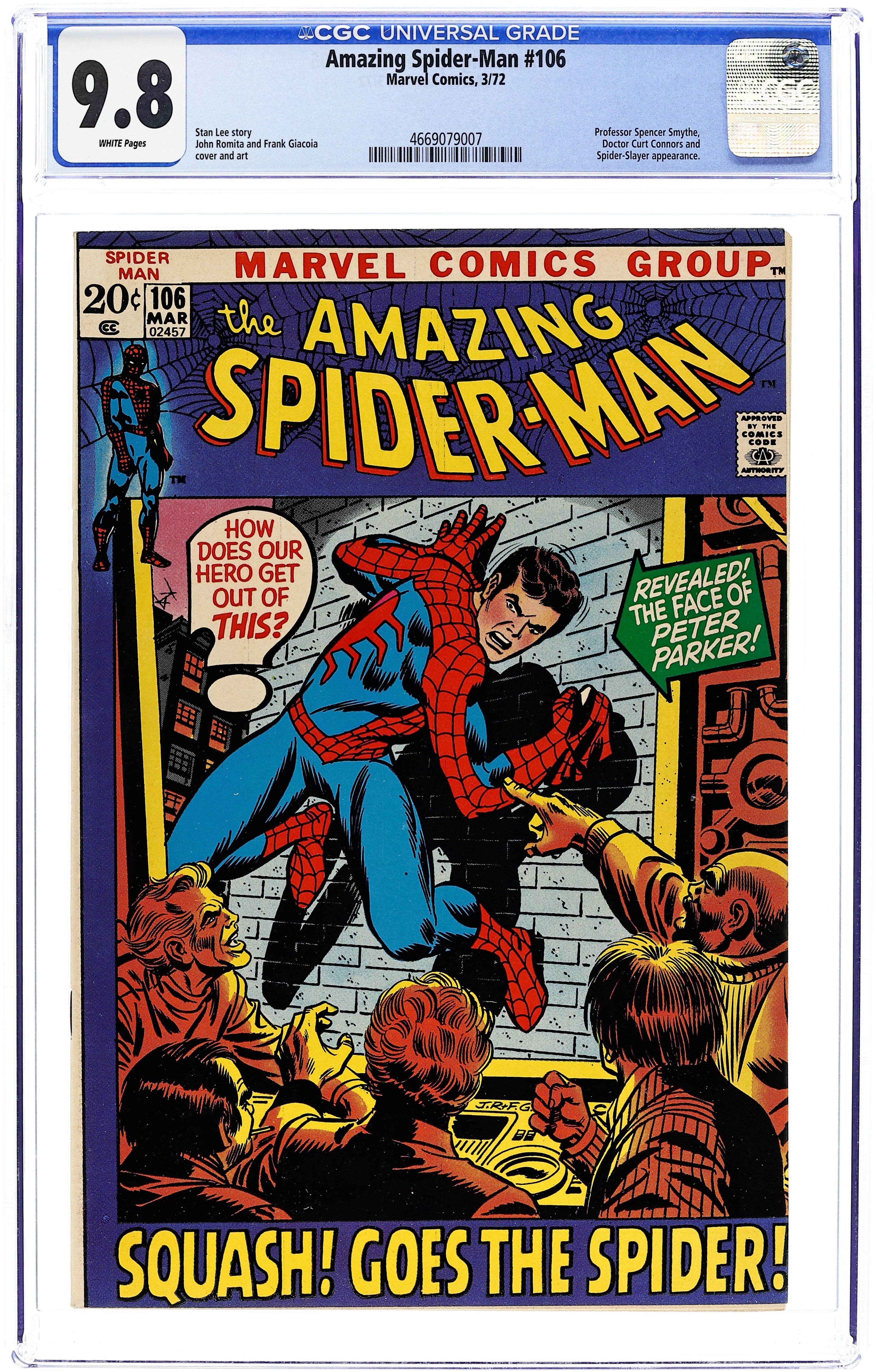 "Squash! Goes the Spider!" Part 2 of 3. Script by Stan Lee. Pencils by John Romita. Inks by Frank Giacoia. Cover by John Romita and Frank Giacoia. After a tough battle vs. the spider slayer, the wall-crawler heads toward home and changes clothes on a nearby rooftop. But once he removes his mask, he notices a spy camera watching him! Did the camera catch Peter Parker's face? The web-slinger can't take a chance, so he makes a nifty synthetic mask to trick Professor Smythe! In the meantime, the professor prepares to take another run at Spider-Man with an even bigger spiderslayer! Is the second time going to be the charm? Cameo appearances by Dr. Curt Connors, J. Jonah Jameson, Joe Robertson, Harry Osborn, Mary Jane Watson, Gwen Stacy, and Flash Thompson. (Notes: Marvel Team-Up (1st series) #1 is also published this month. It becomes Spider-Man's second monthly title. This story was reprinted in Marvel Tales #85.) 36 pages. Cover price $0.20. Grade: CGC 9.8 explanation of grade Condition: Used (collectible)