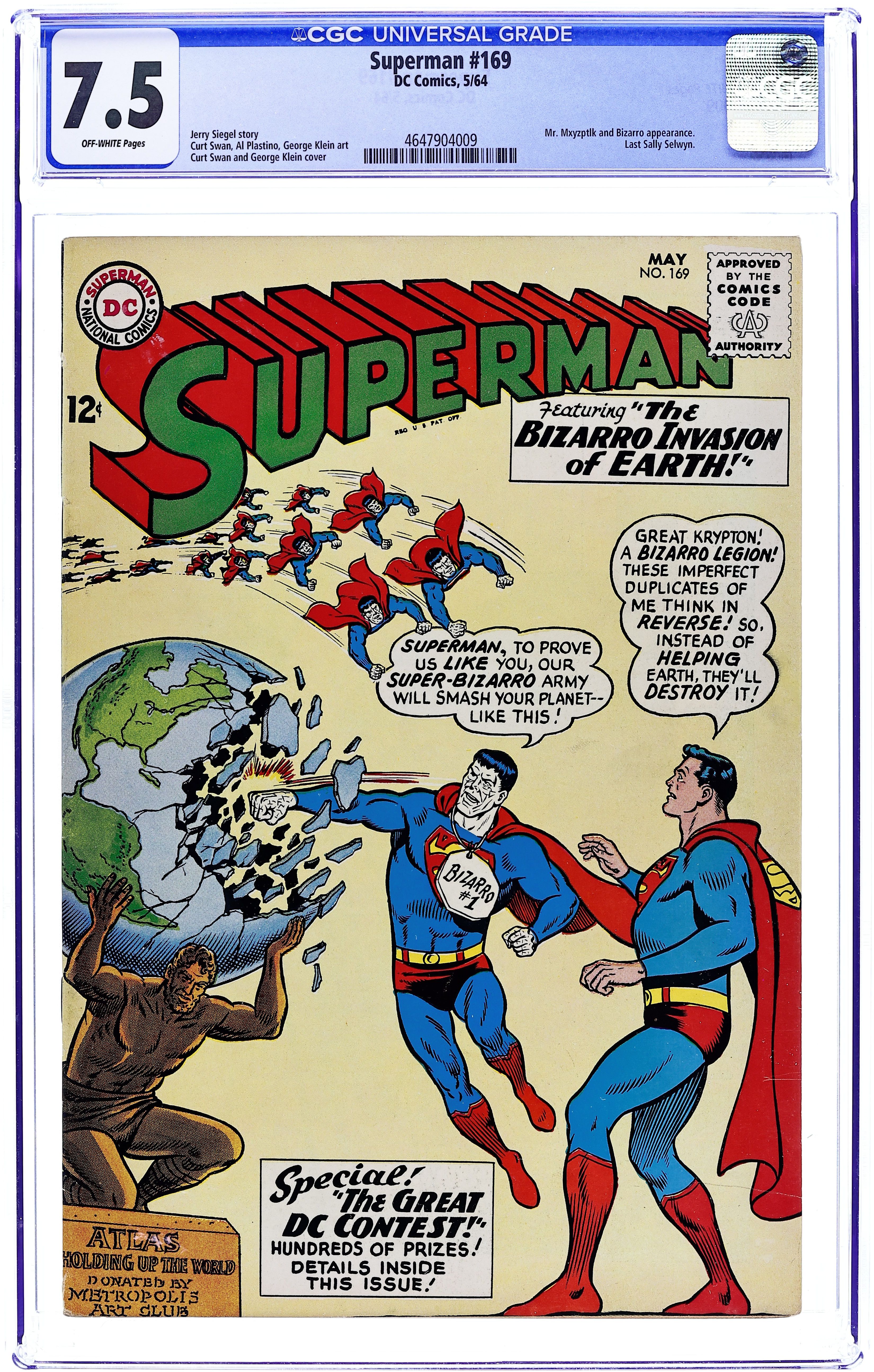 Cover pencils by Curt Swan, inks by George Klein. The Infernal Imp! starring Superman and Mr. Mxyzptlk, script by Jerry Siegel, pencils by Curt Swan, inks by George Klein. The Man Who Stole Superman's Secret Life!, script by Jerry Siegel, art by Al Plastino; a sequel to The Sweetheart Superman Forgot! from Superman #165. The Bizarro Invasion of Earth!, script by Jerry Siegel, art by Al Plastino; The Bizarro Supermen come to Earth and perform "good deeds." Letters page contains a Kryptonite Guide List noting the different kinds of Kryptonite and their effects on Superman. 36 Pages, Full Color. Cover price $0.12. Grade: CGC 7.5 explanation of grade Condition: Used (collectible)