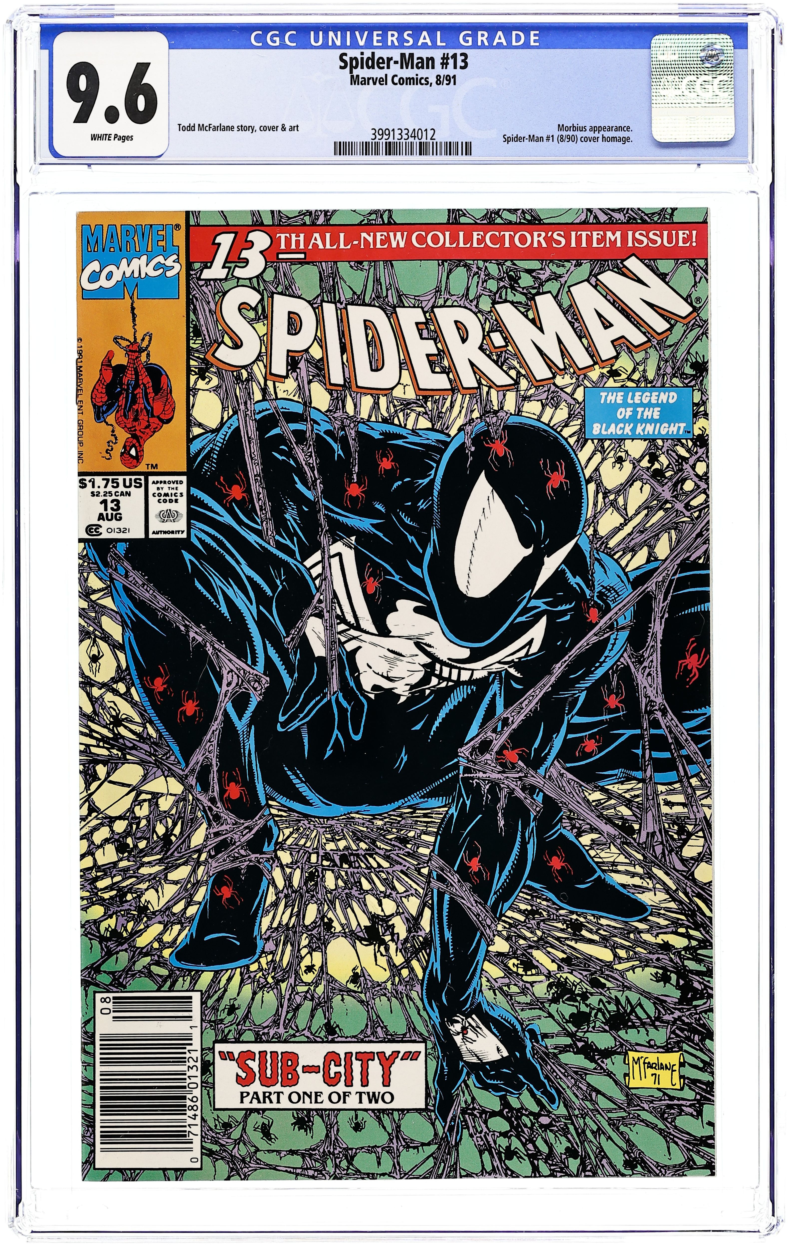 Newsstand Edition. Sub-City: Part 1 of 2. Story, art and cover by Todd McFarlane. To investigate mysterious disappearances, Spidey dons his old black and white suit and enters the macabre world of "Sub-City." The horror of his situation becomes most apparent when Spider-Man come face-to-face with the leader of the underground dwellers - Morbius the Living Vampire! Cover price $1.75. Grade: CGC 9.6 explanation of grade Condition: Used (collectible)