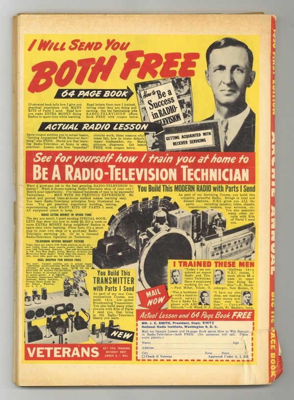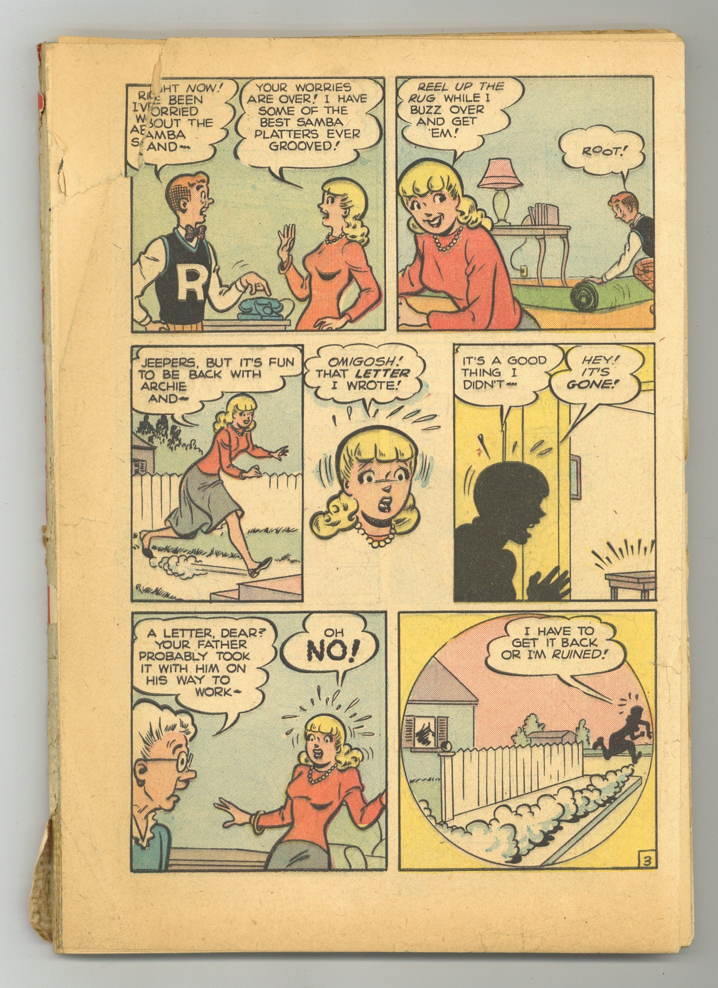 Cover art by Bob Montana. "Notes to You!", script by Ray Gill, pencils by Samm Schwartz; When Archie passes up Betty to talk to Veronica, Betty gets mad and writes him a poison pen letter. "Gym Dandy," script by Ray Gill, art by Samm Schwartz; When the gym falls apart Archie organizes a dance to raise money to build a new gym. "The Battle of the Rattle"; Archie lets Veronica borrow his father's car. "Who's Zoo?"; Jughead's working at the zoo and accidentally lets a monkey loose. Archie Puzzle Fun. "Stop! You're Breaking My Glass"; Archie keeps accidentally breaking glasses in the Chok'lit Shop. "The Rug Cutter!", script by Ray Gill, pencils by Bill Vigoda; Betty can't go to the movies with Archie until she does some chores around the house, and Archie decides to help. "No Soap," script by Ray Gill, pencils by Samm Schwartz; Archie and Betty decide to wash and dry the clothes Archie's mom wanted taken to the laundromat. "The Pin-Up"; Jughead is babysitting and he thinks the baby has swallowed a pin. "The Bugaboo Buster!", script by Ray Gill, pencils by Bill Vigoda; Veronica decides to hold a hard luck party for Friday the thirteenth. "No Pool Like an Old Pool," script by Ray Gill, pencils by Bil Vigoda; It's winter so Archie decides to set up an indoor pool in the attic to swim in. "The Little Squirt," script and pencils by Bill Vigoda; Archie keeps accidentally squirting Mr. Weatherbee with various liquids. "What Makes Jughead Run?"; Riverdale needs to win the track meet, but the coach has to figure out what made Jughead run so fast before. "Nifty Fifty" text story by Ray Gill. "Knights to You"; Archie and Jughead go to the museum and Archie puts on a suit of armor. "Fat's the Spirit," pencils by Samm Schwartz; Archie suddenly becomes fat. "My Job Is Your Job"; Archie needs to earn five bucks to take Veronica out so he has Jughead line up jobs for him to do. "There's a Patch to It!"; There's a patch hop on tonight and Archie wants to avoid being patched by anyone but Veronica. 116 pgs., full color. Cover price $0.25. Grade: PR 0.5 explanation of grade Condition: Used (collectible)