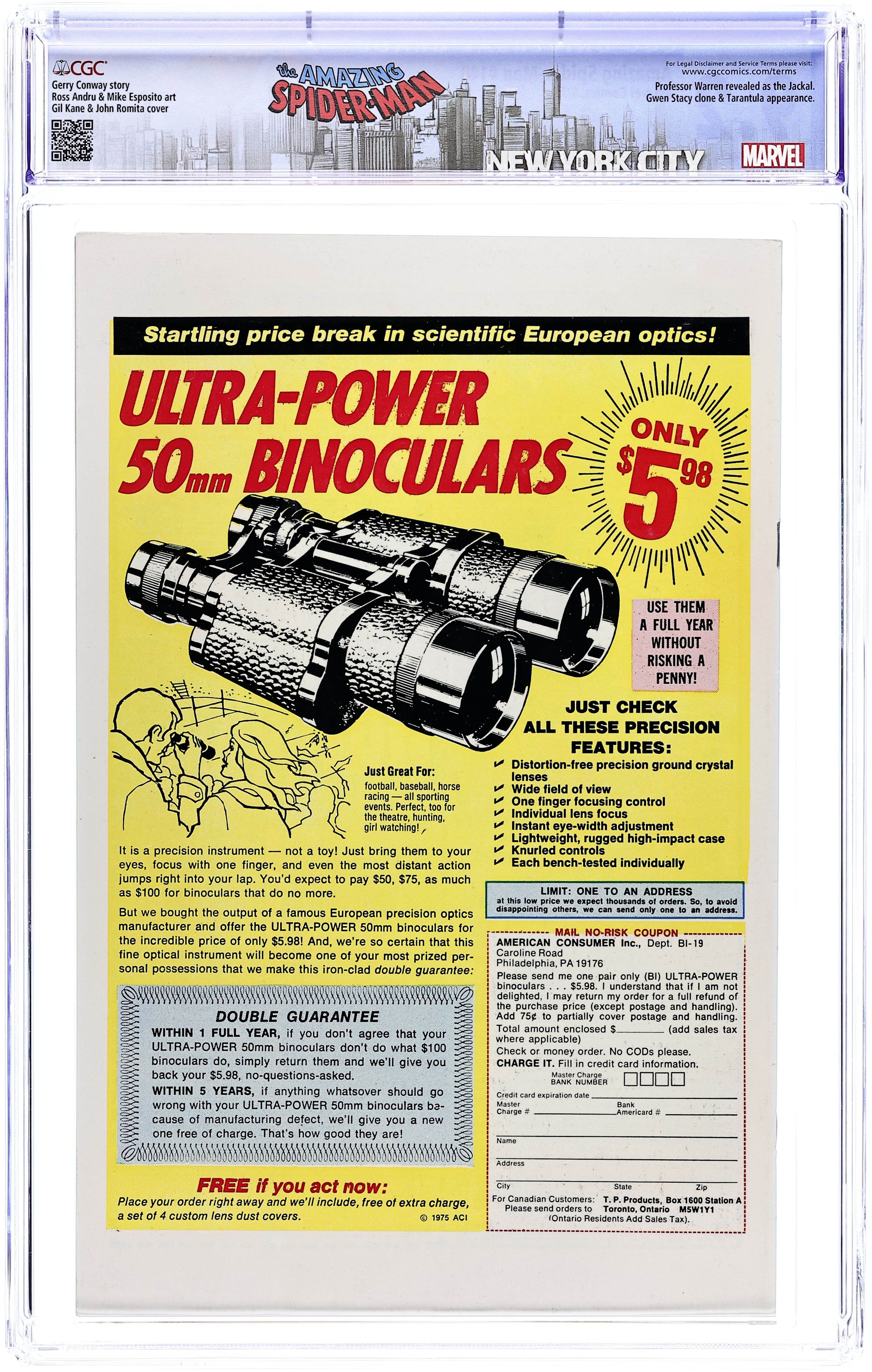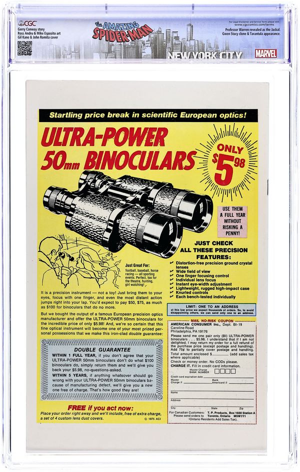 "Jackal, Jackal...Who's Got the Jackal?" Script by Gerry Conway. Pencils by Ross Andru. Inks by Mike Esposito and Dave Hunt (backgrounds). Cover by Gil Kane and John Romita Sr. As shown on the fateful cover, the Tarantula throws the shackled web-slinger off the top of the Brooklyn Bridge! Can the amazing one stop his freefall before slamming into the East River? If not, poor Spidey will sleep with the fishes and never learn the truth behind Gwen's return. Meanwhile at the Daily Bugle, Ned Leeds finally connects the dots about the Gwen Stacy clone! Apparently, Gwen once donated cell tissue samples in Professor Miles Warren's biology class at Empire State University! Hmmm, has the good professor been playing god in his spare time? All will be revealed next issue! Cameo appearance by Mary Jane Watson. Flashback cameos by Anthony Serba and Gwen Stacy. (Note: The letters page includes a letter from Eclipse comics publisher Dean Mullaney. This story was reprinted in Marvel Tales 125.) 36 pages. 25c cover price. Cover price $0.25. Grade: CGC 9.2 explanation of grade Condition: Used (collectible)