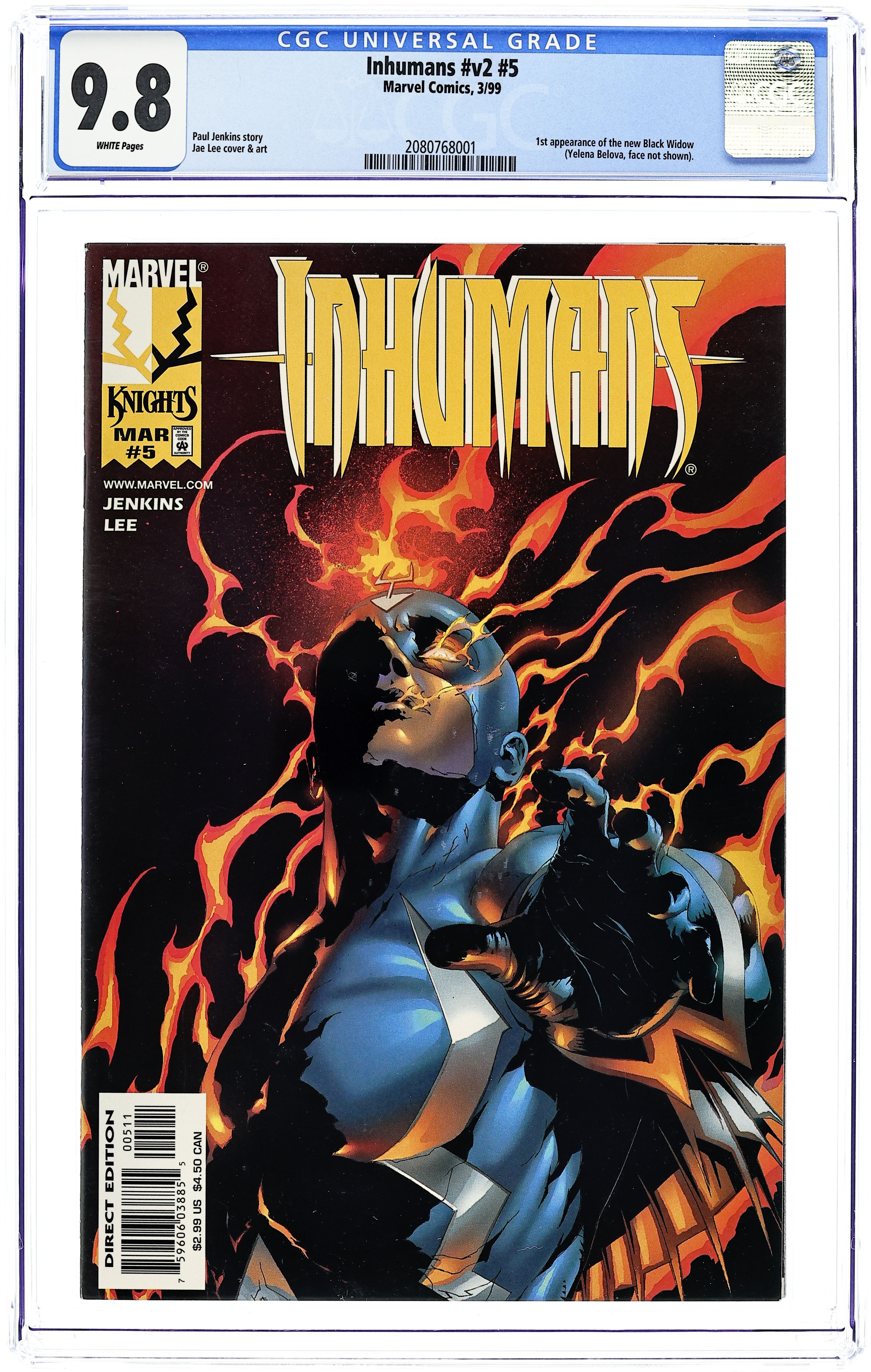 Starts Apr 4 First Contact - Written by Paul Jenkins. Art and Cover by Jae Lee. Earth vs. Attilan -- war! The first salvo has been fired in the assault on the fabled Attilan, whose inhabitants must now decide between diplomacy and retaliation. And while Black Bolt and his closest confidantes weigh their options, the wheels of deception turn in the outside world, as Stalyenko turns to an unlikely source for aid in his campaign against the aliens that live at humanity's door. For all their power, can the Inhumans handle the lies, greed and politics of mankind? Plus: a special guest appearance by the Black Widow, who will soon be starring in her own Marvel Knights limited series! 32 pages, full color. Cover price $2.99. Grade: CGC 9.8 explanation of grade Condition: Used (collectible)