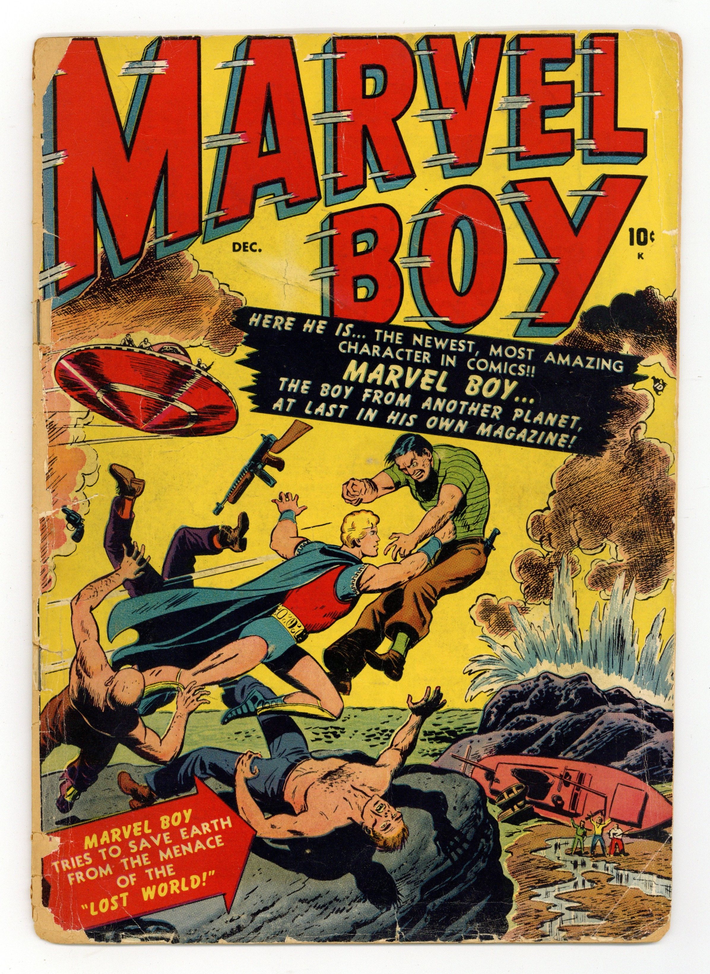 Cover art by Russ Heath. Origin of Marvel Boy in "Marvel Boy and the Lost World," art by Russ Heath; Marvel Boy, Bob Grayson, is sent to earth from Uranus by his father to combat evil; When he arrives, he discovers newly risen continent about to be seized by an international criminal. "Panic!"; The United Allies trick the Red Asiatic League into surrendering by inducing panic. "The Case of the Cat" text story. "Eyes of Death!", art by Russ Heath; An accident gives a scientist x-ray vision. 36 pgs., full color. Cover price $0.10. Grade: PR 0.5 explanation of grade Condition: Used (collectible)