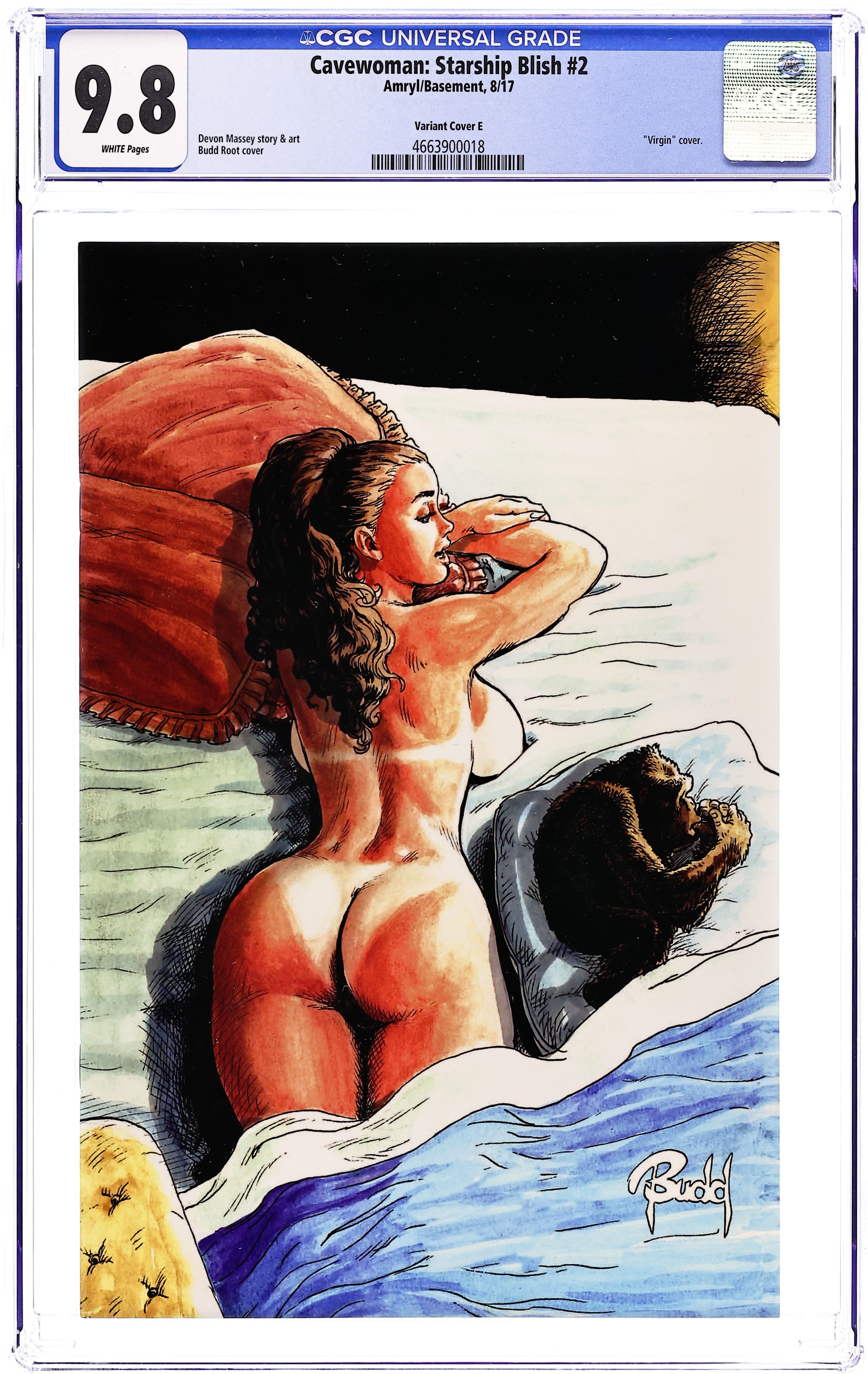 Variant Virgin Cover E by Budd Root. Story and Art by Devon Massey. Meriem has joined the crew of the Starship Blish and the hunt for Ankha is on! Meriem could not defeat her on her own, can she do so now with her newfound allies? 24 pages, B&W. Mature Readers Cover price $3.99. Grade: CGC 9.8 explanation of grade Condition: Used (collectible)