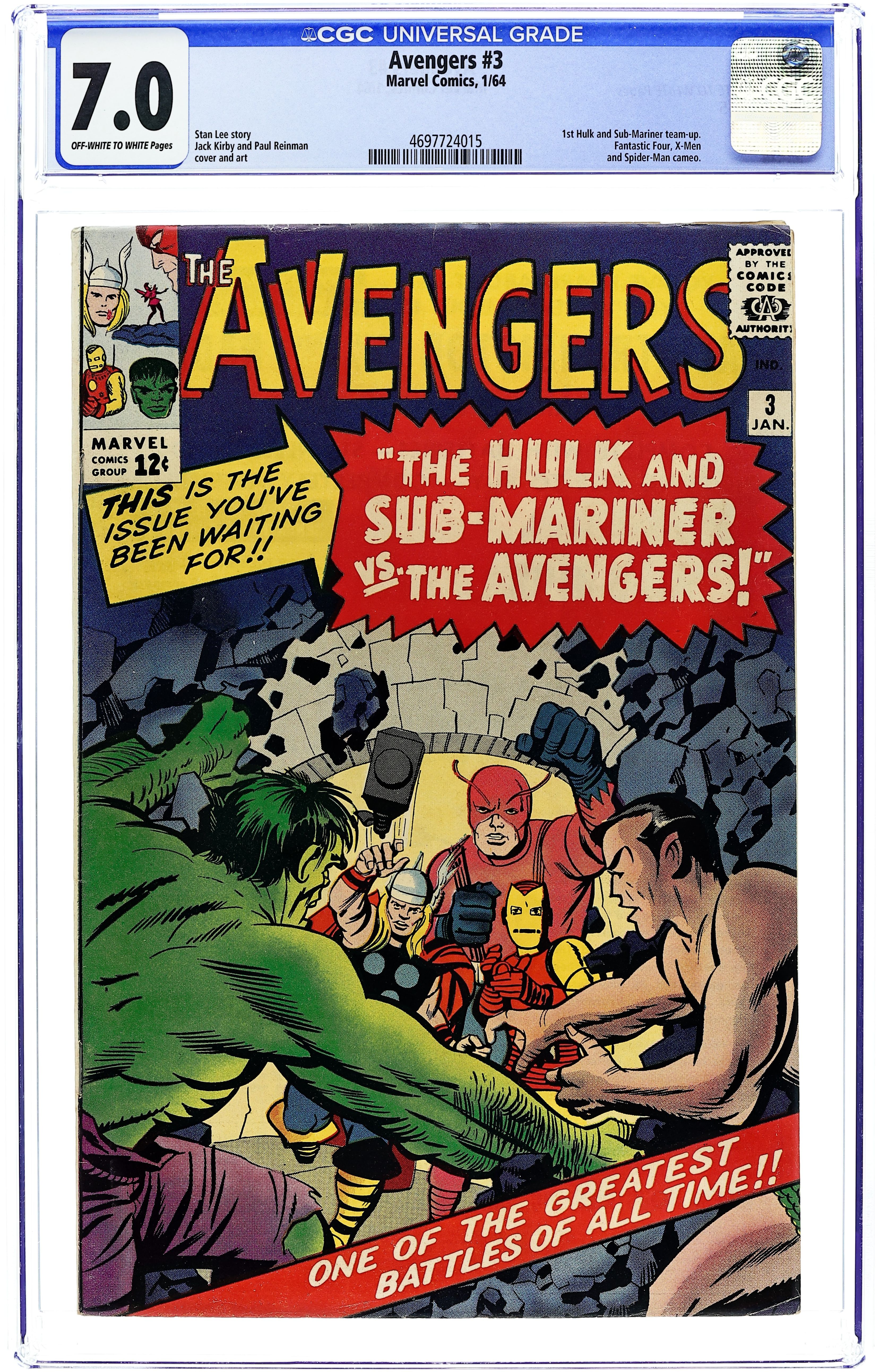 Starts Apr 4 Cover pencils by Jack Kirby, inks by Paul Reinman. The Avengers Meet... Sub-Mariner!, script by Stan Lee, pencils by Jack Kirby, inks by Paul Reinman; After he left them, the Avengers feel responsible for the damages that the Hulk may cause; They start a search for him and find him. When they start to battle, the Sub-Mariner joins the Hulk. Roster includes: Thor, Giant-Man, Wasp, and Iron Man. Guest appearances by the Hulk, Rick Jones, the Sub-Mariner, the Fantastic Four, Spider-Man, the original X-Men, Odin, and miscellaneous Asgardians. 36 pgs. $0.12. Cover price $0.12. Grade: CGC 7.0 explanation of grade Condition: Used (collectible)