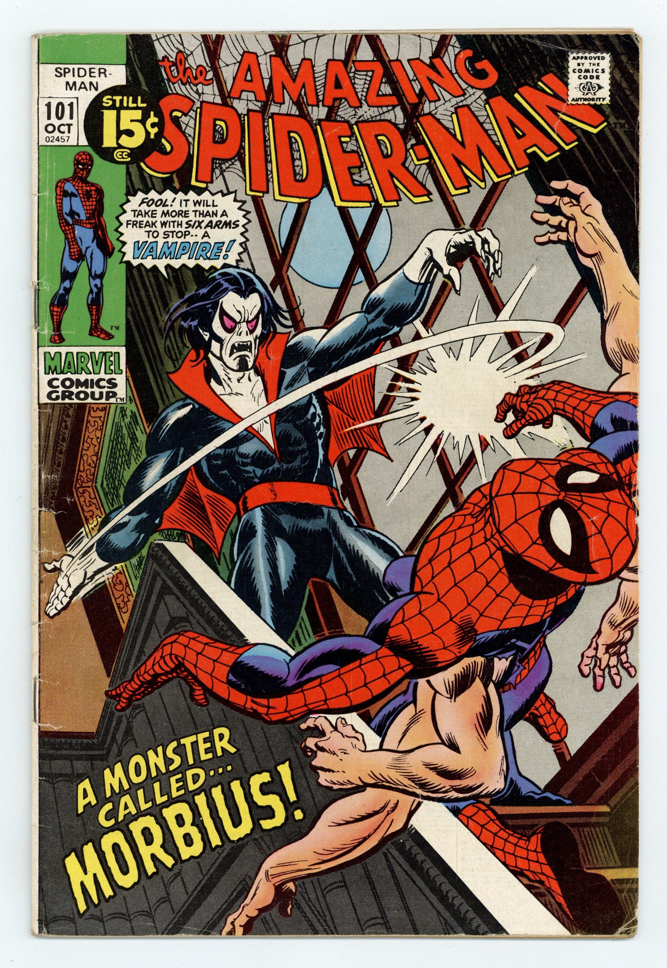 First appearance of Morbius the Living Vampire in "A Monster Called Morbius!" Script by Roy Thomas. Pencils by Gil Kane. Inks by Frank Giacoia. Cover by Gil Kane and John Romita. The first 100 issues of the Amazing Spider-Man title are in the books! And the next chapter in the web-slinger's anthology kicks off with the debut of Marvel's first bronze age vampire: Morbius! However, at the moment Peter Parker has a much bigger problem on his (six) hands. After drinking the special potion he developed, Aunt May's nephew grew four additional arms! Oh, my goodness! Peter is desperate to find a way to remove the arms, so he calls Dr. Curt Connors for help. Dr. Connors has a summer house and laboratory in Southampton on Long Island...and he gives Spider-Man permission to stay there and work on a cure. Meanwhile, a strange, pale, and bloodthirsty man is the sole survivor of a shipwreck near Southampton. And he's looking for a quiet place to rest. Oh no. Is the six-armed Spider-Man on a collision course with a living vampire? Oh yes! Cameo appearances by Gwen Stacy, J. Jonah Jameson, Joe Robertson, and the Lizard. Last 15ยข cover price. (Notes: This is the first issue of the Amazing Spider-Man series not written by Stan Lee. There exists a second printing of this issue published in 1992 with a silver background cover. Marvel also published a facsimile edition of Amazing Spider-Man 101 in 2021.) 36 pages. Cover price $0.15. Grade: VG 4.0 explanation of grade Condition: Used (collectible)