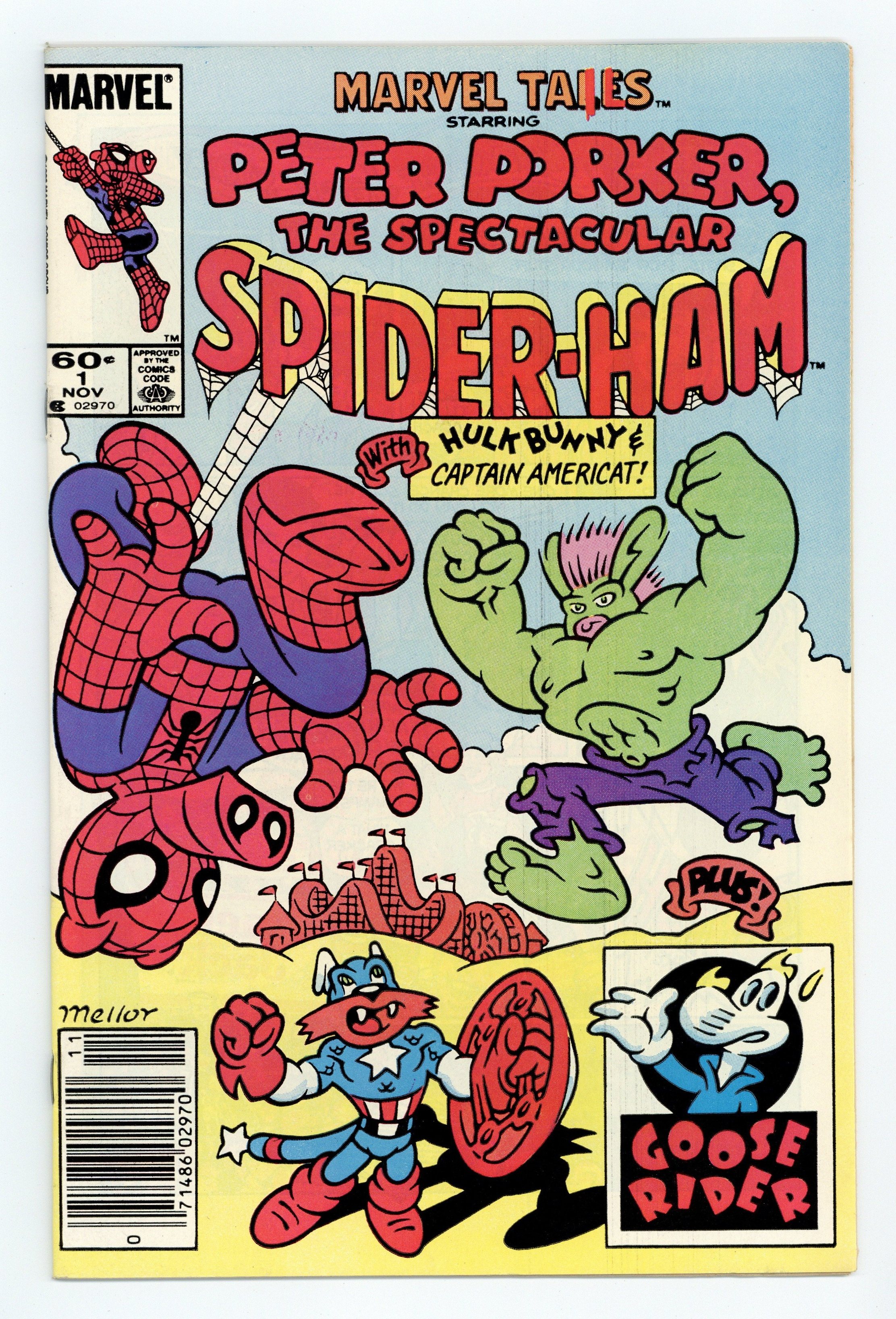 Starts Apr 27 Newsstand Edition. 1st appearances of Spider-Ham, Hulk Bunny, Goose Rider and more. Cover by Steve Mellor. Written by Tom DeFalco and Steve Mellor. Art by Mark Armstrong, Steve Mellor and Joe Albelo. Captain Americat and Spider-Ham investigate a saboteur destroying a video arcade and run up against Hulk Bunny in "If He Should Punch Me!" by Tom DeFalco, Mark Armstrong and Joe Albelo. Characters in this story: Spider-Ham [Peter Porker]; Captain Americat; Hulk Bunny; J. Jonah Jackal; The Gopher Gang (villain); Masked Marauder (villain). Plus: "Goose Rider" back-up story by Steve Mellor. Characters in this story: Goose Rider; Chainsaw (villain). 32 pages, full color. Cover price $0.60. Grade: VF- 7.5 explanation of grade Condition: Used (collectible)