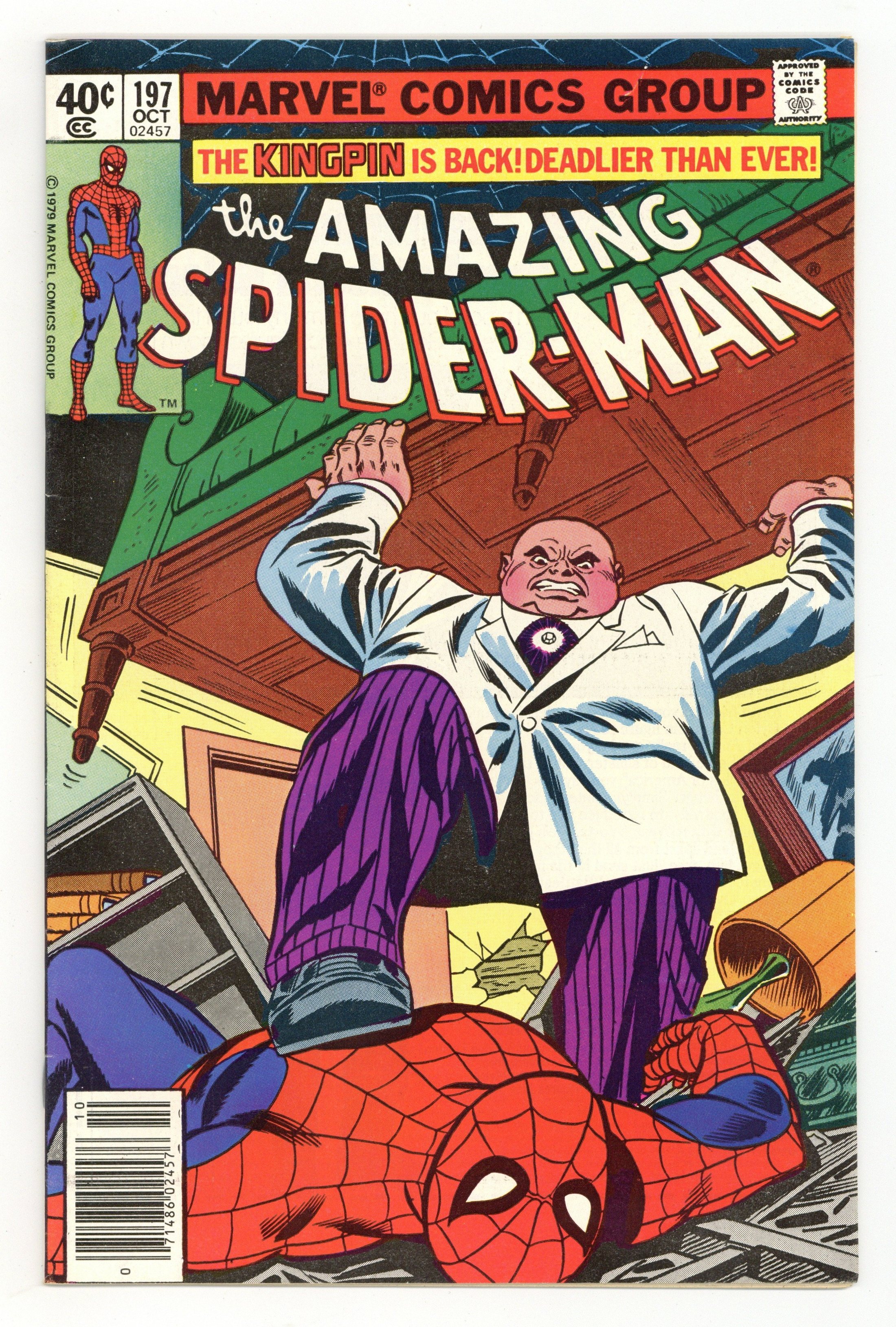Newsstand Edition. "The Kingpin's Midnight Massacre!" Script by Marv Wolfman. Art by Keith Pollard (layouts) and Jim Mooney (finishes). Cover by Keith Pollard and Frank Giacoia. One of wall-crawler's best battle issues of the bronze age! The Amazing Spider-Man and the Kingpin of Crime fight from cover to cover and then some! To the web-slinger's chagrin, the Kingpin survived his plunge into the river (at the end of Amazing Spider-Man 164)! And now the over-sized crime boss has only one task left before retiring from his life of crime: destroy his long-time web-slinging foe! However Vanessa Fisk has told her husband to finish the job before midnight! So the Kingpin is working against a deadline, while the wall-crawler is just trying to run out the clock! An outstanding issue! Cameo appearances by Mysterio (in civilian clothes) and the burglar. (Notes: This issue marks a major turning point for the Kingpin. The popular super-villain transitions into Frank Miller's Daredevil title to become a major antagonist of the Man Without Fear beginning in Daredevil 170 & 171.) 36 pages. Cover price $0.40. Grade: FN+ 6.5 explanation of grade Condition: Used (collectible)