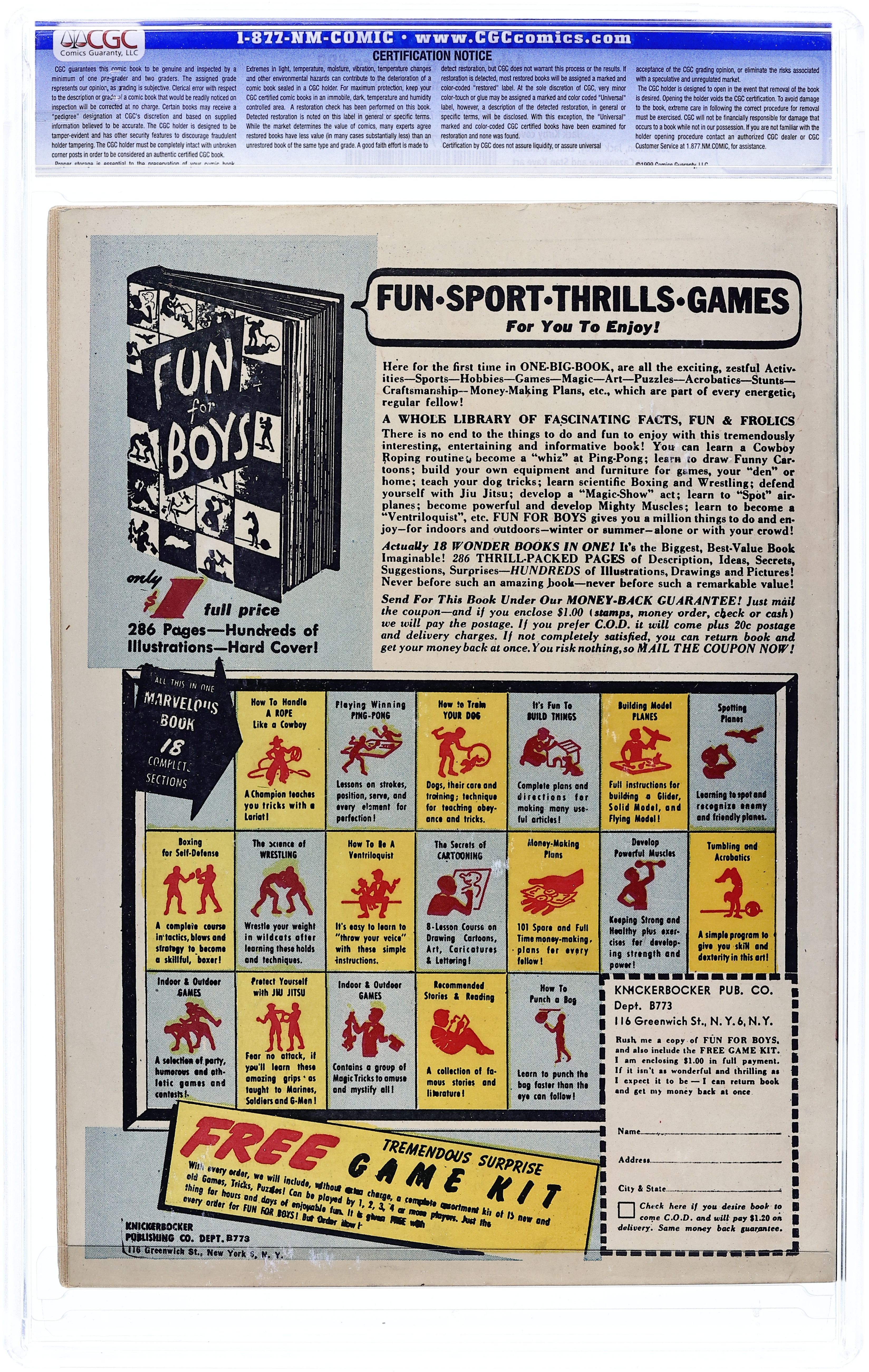 Cover pencils by Jack Kirby. The Cruise of the Crescent starring The Sandman, script and pencils by Jack Kirby, inks by Joe Simon; Young Jerry borrows his grandfather's model boat, "The Crescent", and takes it down to the docks to sail it. Death of Genius Jones starring Genius Jones, art by Stan Kaye. Prisoners of Peril starring Shining Knight, art by Louis Cazeneuve. The Enigma of the Vanishing House! starring Starman, script by Gardner F. Fox, art by Emil Gershwin. Loaded For Bear starring Manhunter, pencils by Pierce Rice. Bombs Over Brittany starring Mike Gibbs, Guerilla, script by Joe Samachson, art by Irving Tirman. 60 pages, Full Color. Cover price $0.10. Grade: CGC 9.0 explanation of grade Condition: Used (collectible)