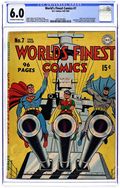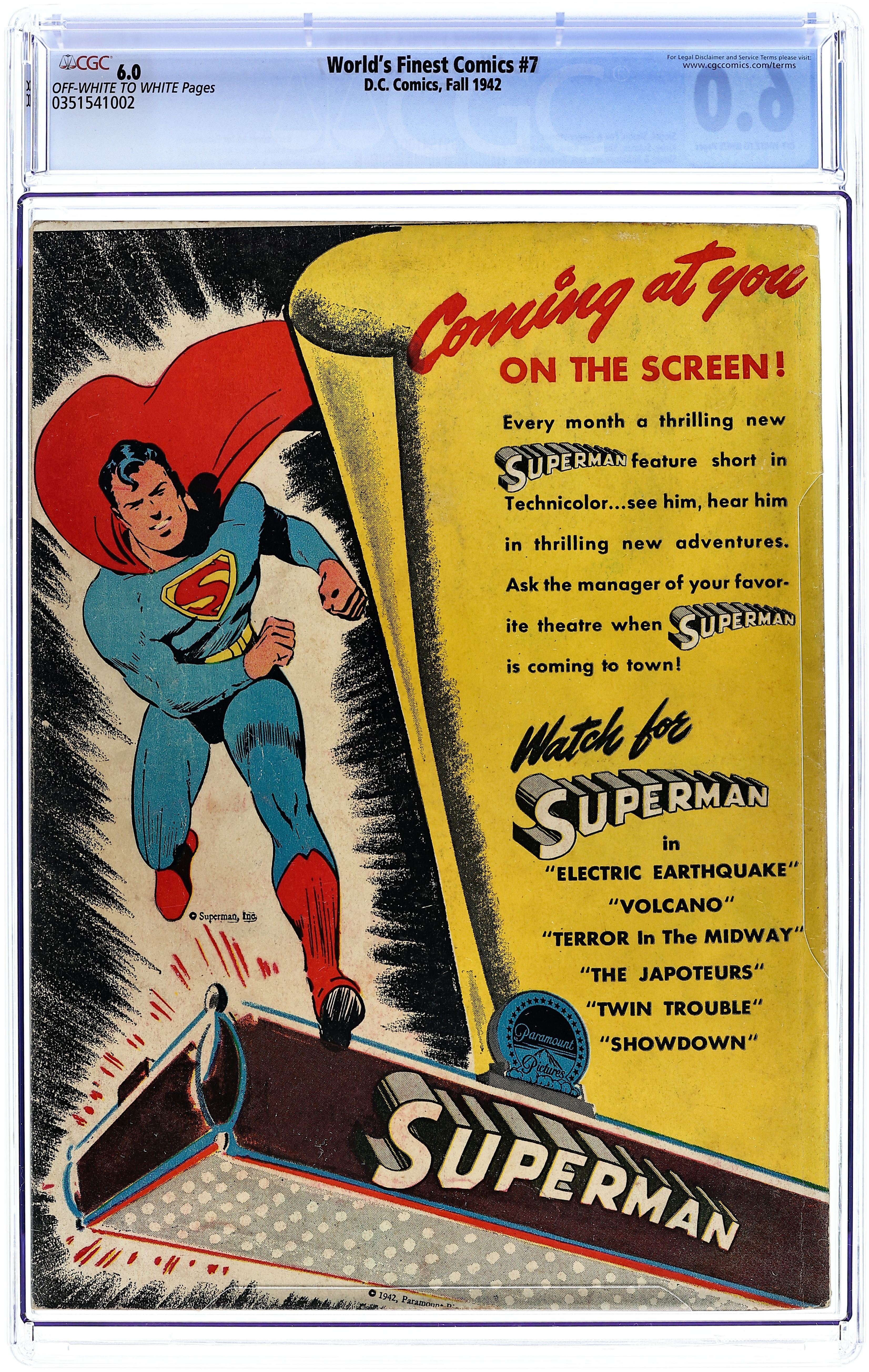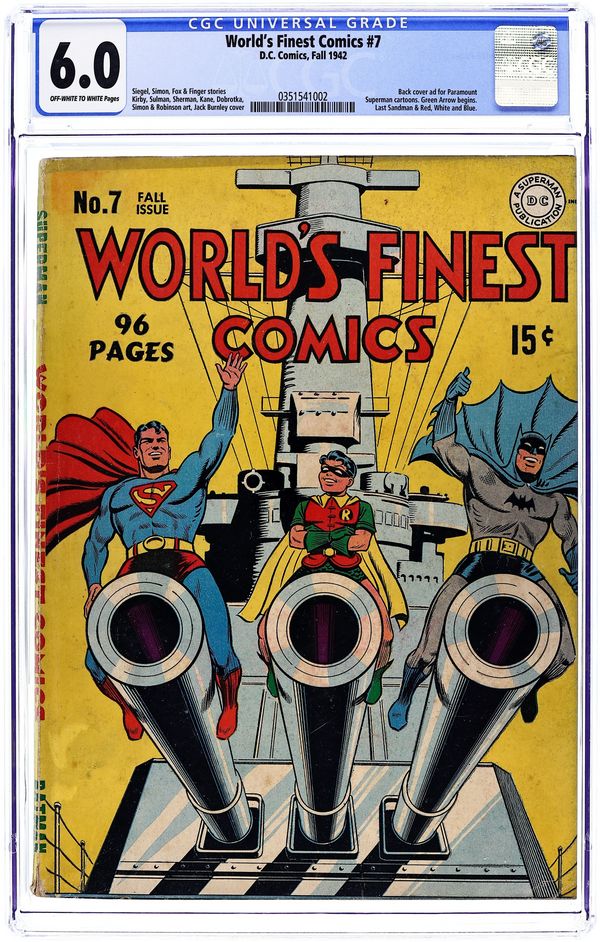 Cover art by Jack Burnley. The Eight Doomed Men! starring Superman, script by Jerry Siegel, pencils by Ed Dobrotka [as Joe Shuster], inks by John Sikela [as Joe Shuster]; The members of the Elkhart University Pi Theta Dau fraternity vow upon graduation to meet 20 years later, and that they do.......where someone vows to kill each and every one of them! Case of the Walking Dynamo, art by Joseph Sulman. Wise Lady, script by Edgar Weston, art by Fred Ray. A Modern Arabian Nightmare starring The Sandman and Sandy, script by Joe Simon, pencils by Jack Kirby, inks by Joe Simon. The Case of the Jinxed Skyscraper starring The Star Spangled Kid and Stripesy, script by Jerry Siegel, art by Hal Sherman. The Phantom Voice starring Red, White and Blue, art by Ken Battefield [as Kajeb]. Wings of Flame starring The Green Arrow, art by Bernard Klein. The Vanishing V-Men starring Lando, art by Harris Levy. The North Pole Crimes! starring Batman and Robin, script by Bill Finger, pencils by Bob Kane, inks by Jerry Robinson; A ruthless gang of criminals heads to the far north to commit crimes and the Dynamic Duo must solve the riddle of their leaving a snowman at the scene of every crime they commit. Advertisement for Paramount Picture's Superman cartoon series. 100 pages, Full Color. Cover price $0.15. Grade: CGC 6.0 explanation of grade Condition: Used (collectible)