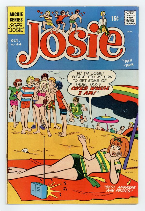 Starts Apr 27 Cover pencils by Dan DeCarlo, inks by Rudy Lapick. Spellbound; Alexandra tries to use Sebastian to cast spells on her visiting friends, but her magic doesn't work as planned, though she does manage to uncover a network of secret passages in the Cabot mansion. Beachhead/Melody Of Love; Every time Josie tries to attract a boy at the beach, the bikini-clad Melody comes along and unwittingly steals him away. Script by Frank Doyle, pencils by Dan DeCarlo, inks by Rudy Lapick. 36 pgs. $0.15. Cover price $0.15. Grade: FN+ 6.5 explanation of grade Condition: Used (collectible)