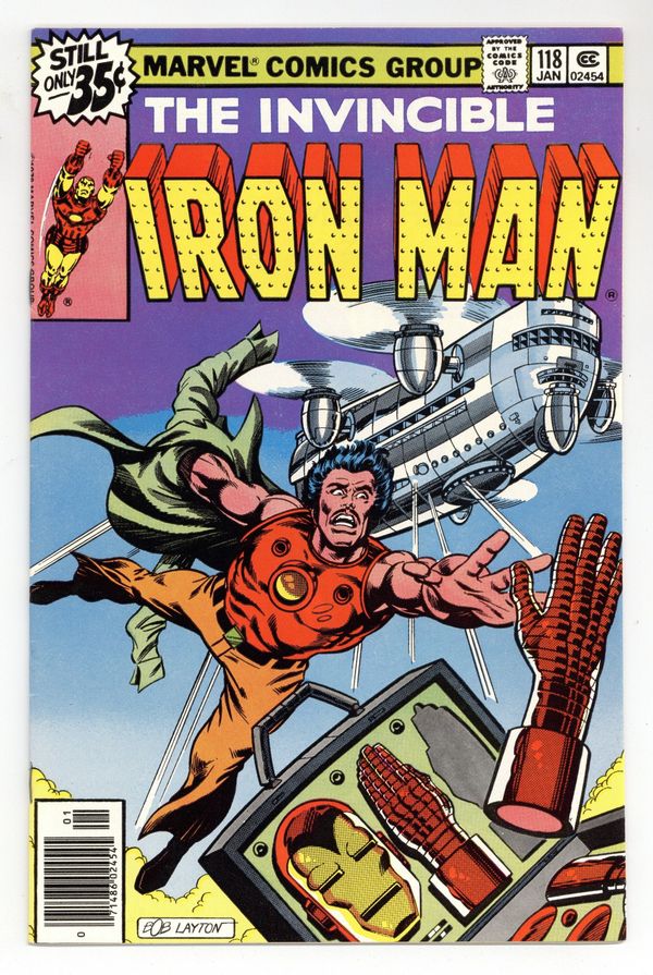 First appearance of James Rhodes in "At the Mercy of My Friends!" Part 1 of 2. Guest-starring Nick Fury. Plot by David Michelinie and Bob Layton. Script by David Michelinie. Art by John Byrne (layouts) and Bob Layton (finishes). Cover by Bob Layton. Tony Stark visits the SHIELD Helicarrier for a NATO conference, but rouge agents throw him out over the skies of Western Europe! Fortunately (as shown on the terrific cover), Tony has his briefcase with him! But can he change into his armor in time? Cameo appearances by Mrs. Arbogast and Bethany Cabe. 32 pages. Cover price $0.35. Grade: VF 8.0 explanation of grade Condition: Used (collectible)
