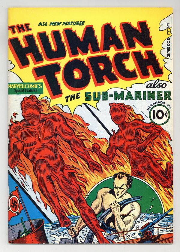 The 21st issue of the Flashback reprint series presents HUMAN TORCH # 1 originally published in 1940 by Timely/Marvel Comics. Origin and first appearance of Toro. Human Torch (by Carl Burgos), the Sub-Mariner (by Bill Everett), the Falcon, Microman, Mantor the magician, and the Fiery Mask. One-page text feature of how Burgos created the Human Torch. One-page text feature of how Everett created the Sub-Mariner. full color cardstock covers, 7-3/4-in. x 10-3/8-in. black-and-white interior on white paper stock, saddle-stitched binding. Cover price $3.00. Grade: VF- 7.5 explanation of grade Condition: Used (collectible)