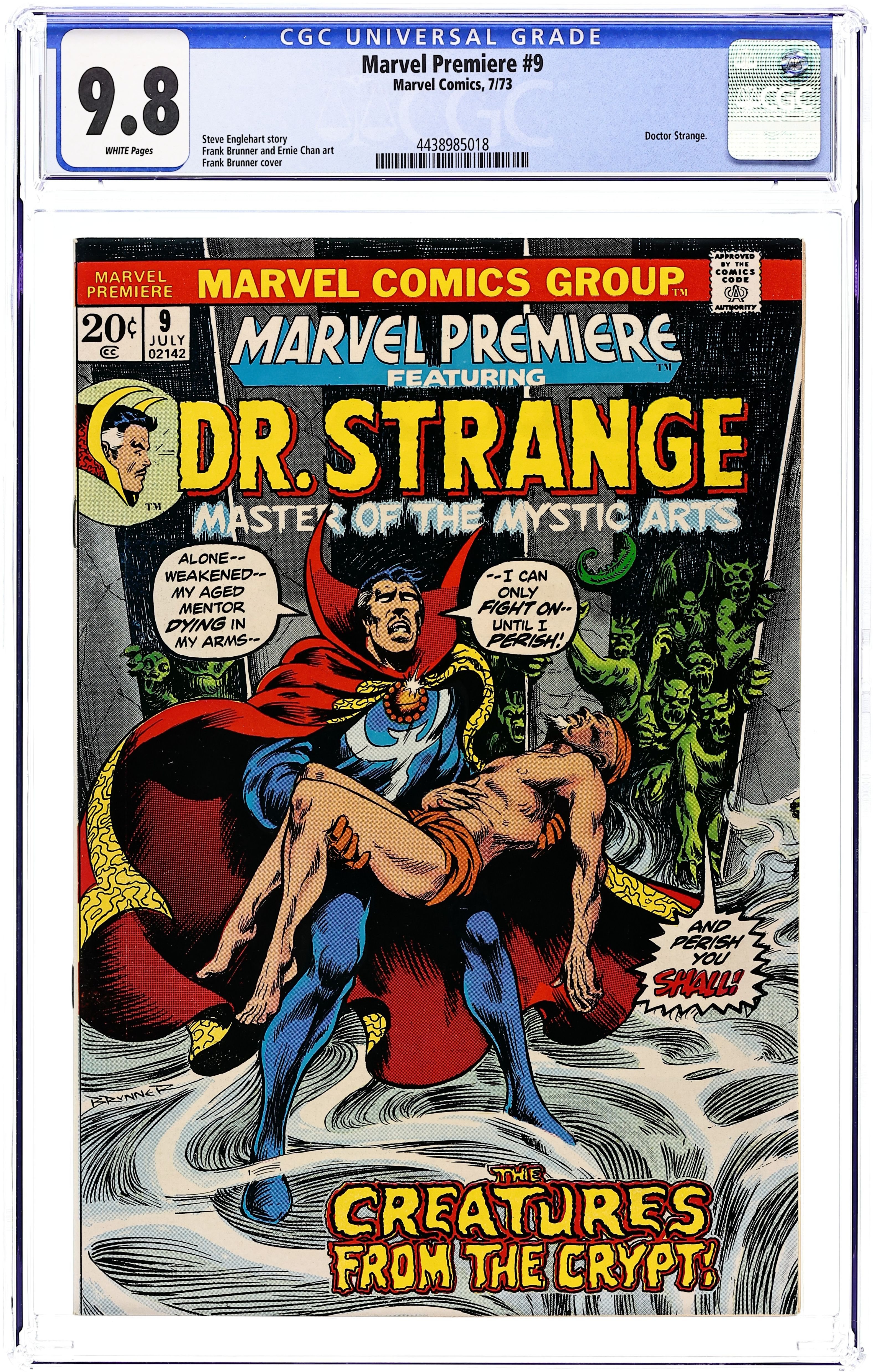 Cover art by Frank Brunner. The Crypts of Kaa-U!, script by Steve Englehart (co-plot, script) and Frank Brunner (co-plot), pencils by Frank Brunner, inks by Ernie Chan [as Ernie Chua]; Strange finds essence of Shuma-Gorath, whose trail leads to crypts of Kaa-U, where The Ancient One has gone to die; The Ancient One saves Strange from attack of Shadowmen, & Shuma-Gorath emerges from the Ancient One's mind. 36 pgs. $0.20. Cover price $0.20. Grade: CGC 9.8 explanation of grade Condition: Used (collectible)