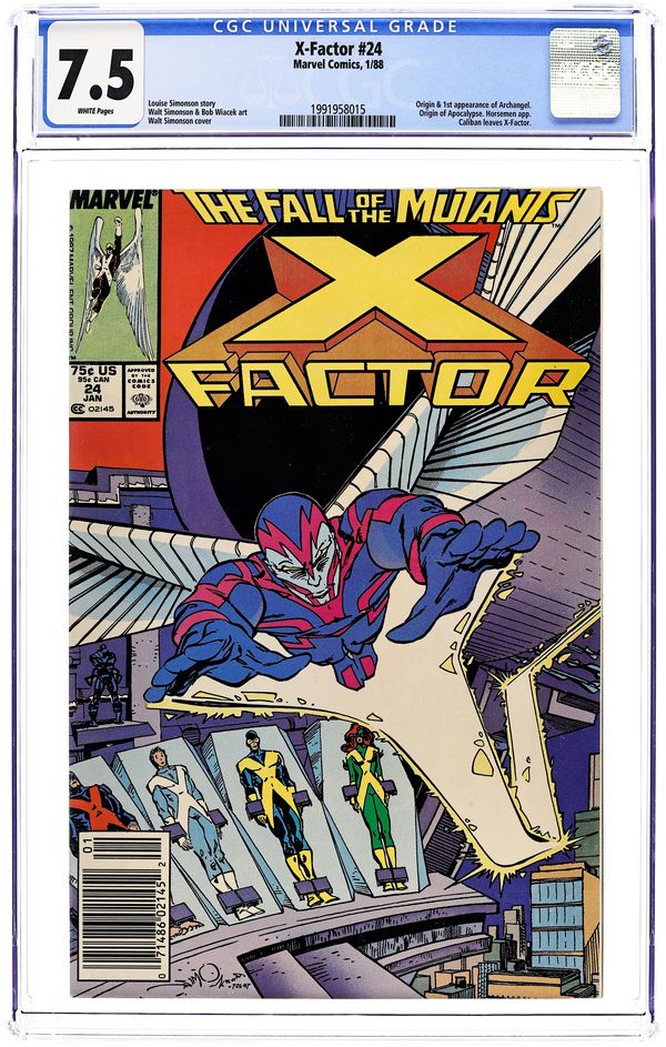 Newsstand Edition. Fall of the Mutants! Part 1 of 3. "Masks!" 1st full appearance of Archangel. Story by Louise Simonson. Art by Walter Simonson and Bob Wiacek. One of the biggest mutant events to ever hit the comic racks begins here. The powerful mutant known as Apocalypse finally makes his move and unleashes his Four Horseman on an unsuspecting world. The only thing standing between humanity and total annihilation is X-Factor. However when the fourth and final Horseman, Death, reveals his true identity, the group will be rocked to its very core. This is a pivotal chapter in the lives of the original X-Men. Cover price $0.75. Grade: CGC 7.5 explanation of grade Condition: Used (collectible)
