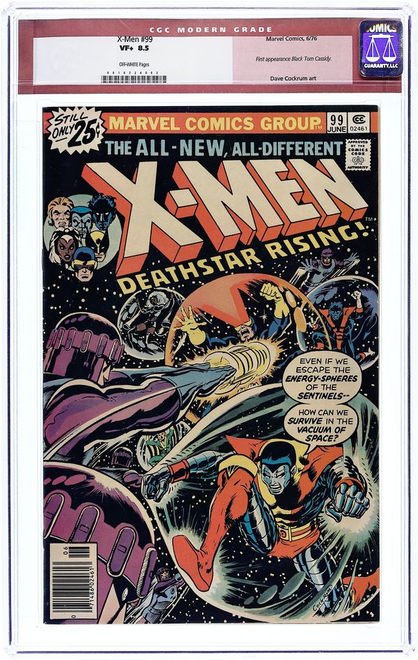 "Deathstar, Rising!" Part 2 of 3. Story by Chris Claremont. Art by Dave Cockrum and Frank Chiaramonte. The new X-Men boldly go where no X-Men have gone before as their battle with the mutant hating Sentinels takes to the edge of space and beyond. But before they can stop the madman Steve Lang, the X-Men will come face-to-face with the last people they expected to see! 36 pgs. Cover price $0.25. Grade: CGC 8.5 explanation of grade Condition: Used (collectible)