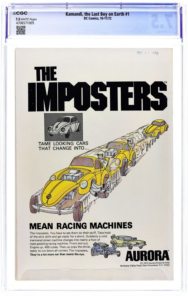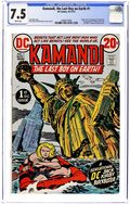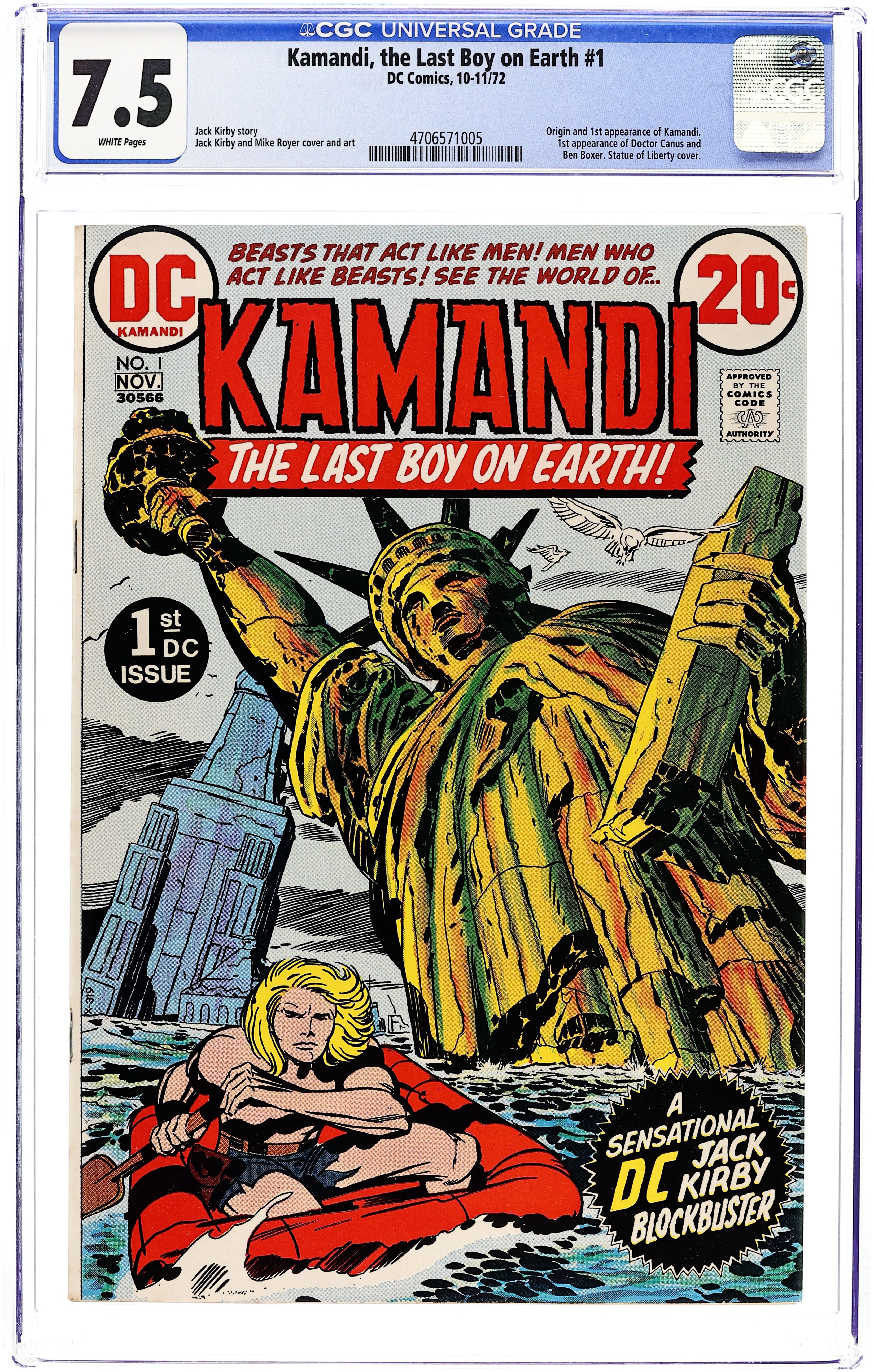 1st appearance and origin of Kamandi. "The Last Boy on Earth." Script and pencils by Jack Kirby, inks by Mike Royer. Cover by Kirby and Royer. A series that borrows many concepts from Planet of the Apes, Kamandi takes place in an alternate future where animals have mutated into bipedal beings of intelligence and where humans are treated like savage beasts. Kamandi avenges the death of his grandfather, who was killed by wolves, but is then captured by a tiger named Caesar, who turns him over to dog-scientist Dr. Canus. Canus proceeds to help Kamandi, and this is where the so-called last boy on earth hooks up with Ben Boxer, a mutated human who can turn to living metal. Cover price $0.20. Grade: CGC 7.5 explanation of grade Condition: Used (collectible)