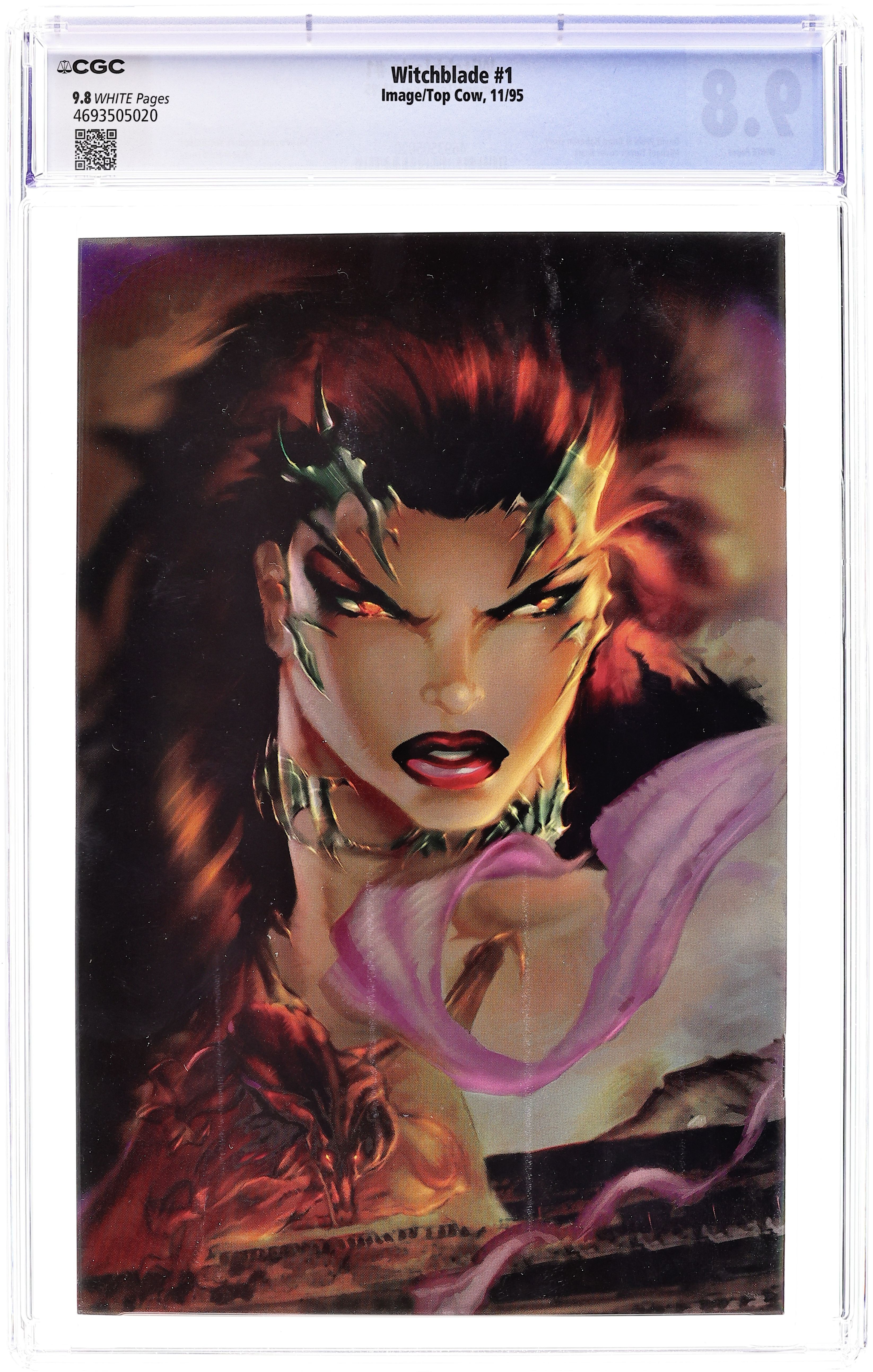 Wraparound cover art by Michael Turner. Untitled Witchblade story, script by David Wohl, Brian Haberlin (co-plot), and Michael Turner (co-plot), pencils by Michael Turner, inks by D-Tron. Police officer Sara Pezzini dresses to kill and engages in an unauthorized sting of a group of local drug dealers; she is chewed out by her boss for her antics and because she endangered her partner, Michael Yee, who was already undercover on the operation. During the interrogation of drug informant Drexler, Sara and Michael learn about something big going down at the old Rialto theatre on that very night, but on their way to the Rialto, Sara and Michael are called to a crime scene where the victim has literally been cooked from the inside out. Superstar businessman Kenneth Irons and his deadly bodyguard, Nottingham, begin their tournament by offering paying attendees a chance to try on a mystic gauntlet called the Witchblade. Sara has snuck in solo and watches in horror as mob boss, Cugliani, sticks his hand into the Witchblade and has it burned off; Irons' men catch Michael lurking about outside and prepare to execute him. 36 pgs. $2.50. Cover price $2.50. Grade: CGC 9.8 explanation of grade Condition: Used (collectible)