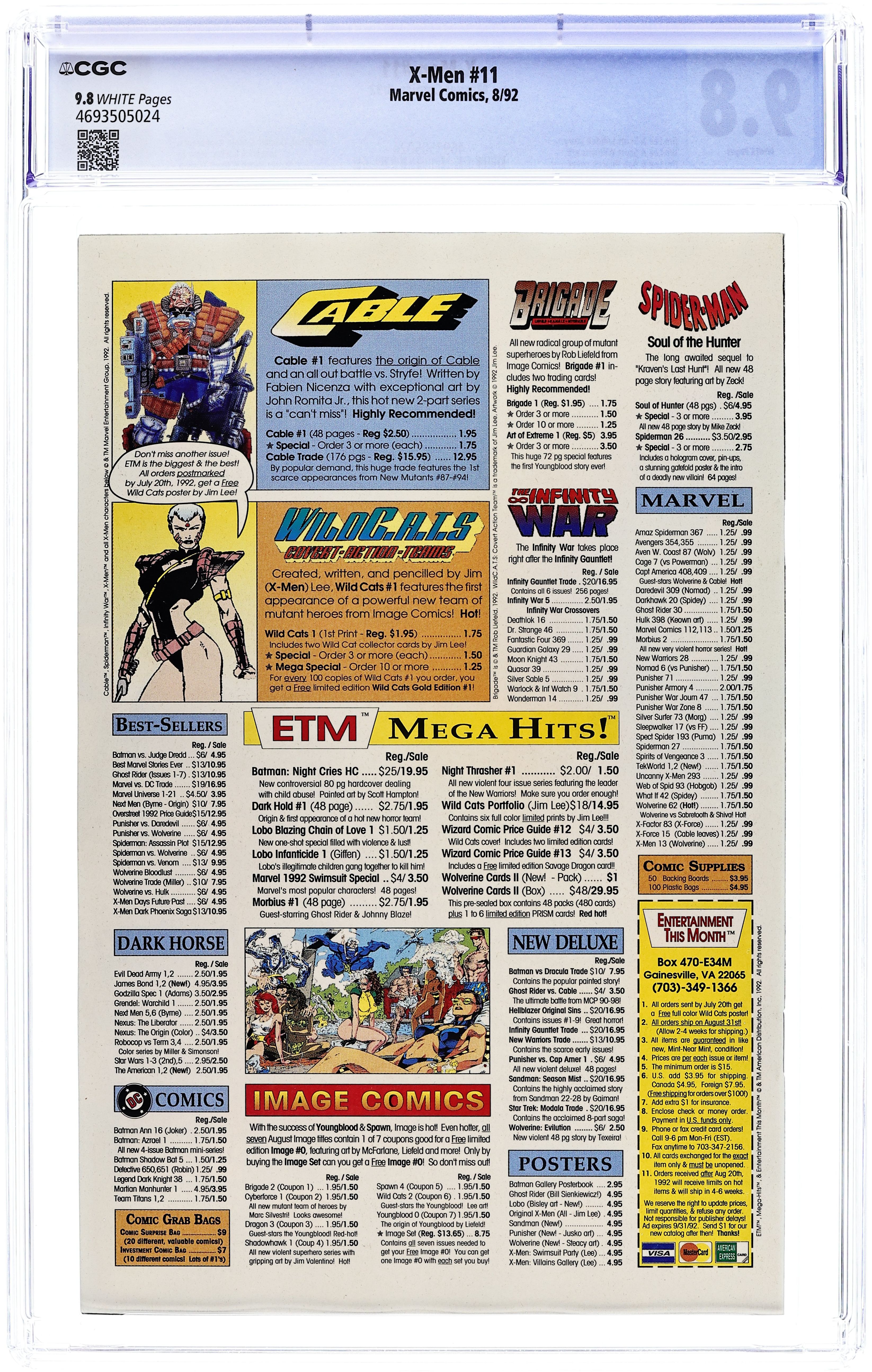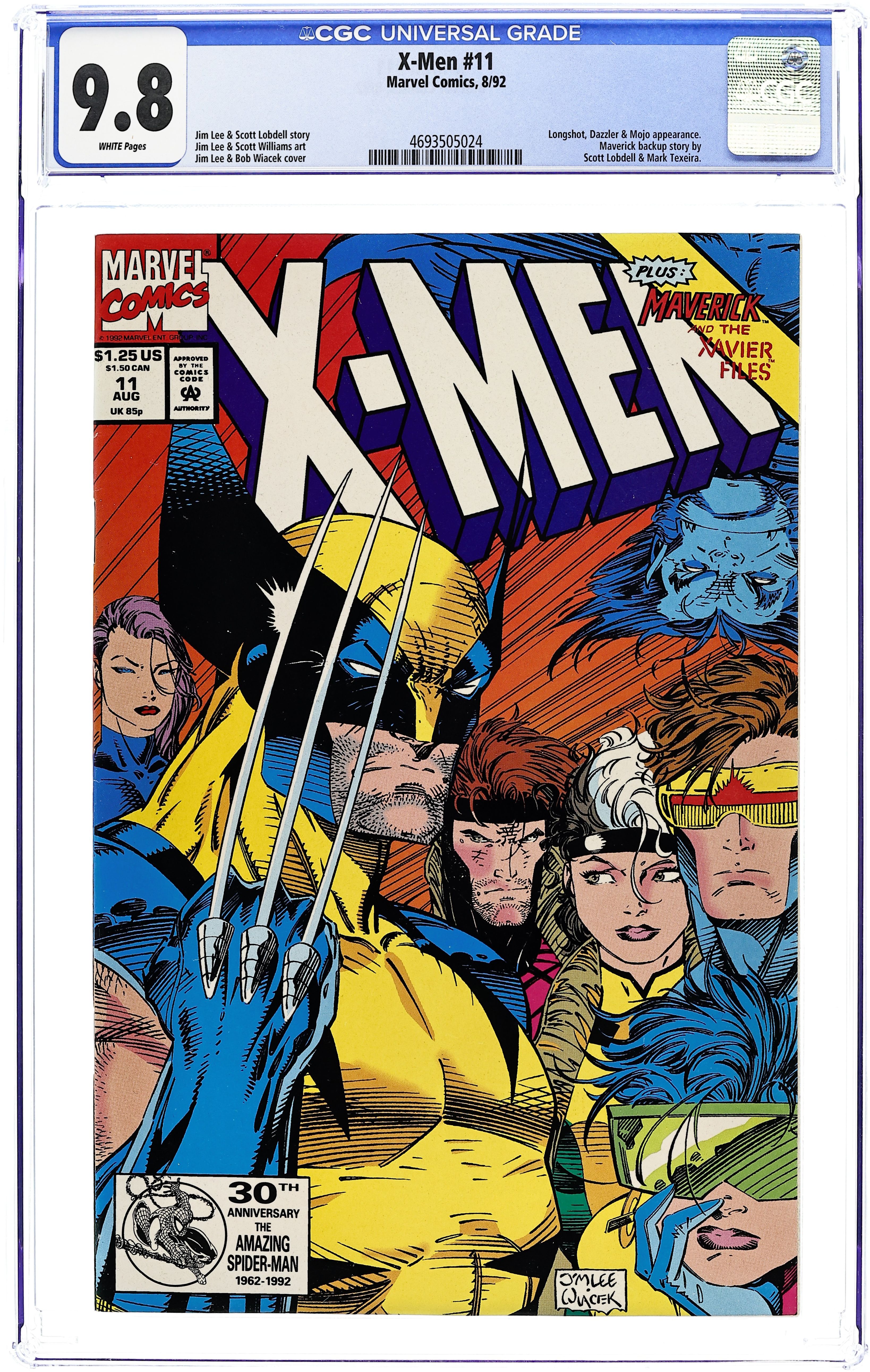 Standard Direct Edition. Cover pencils by Jim Lee, inks by Bob Wiacek. The X-Men vs. The X-Men! (Again) with our special guests...the X-Men!, script by Jim Lee (Plot) and Scott Lobdell, pencils by Jim Lee, inks by Bob Wiacek; The X-Men help Longshot overthrow Mojo to make way for his sequel. Over...Again starring Maverick, Dr. Ryking, and Warhawk, script by Scott Lobdell, art by Mark Texeira. 36 pgs. $1.25. Cover price $1.25. Grade: CGC 9.8 explanation of grade Condition: Used (collectible)