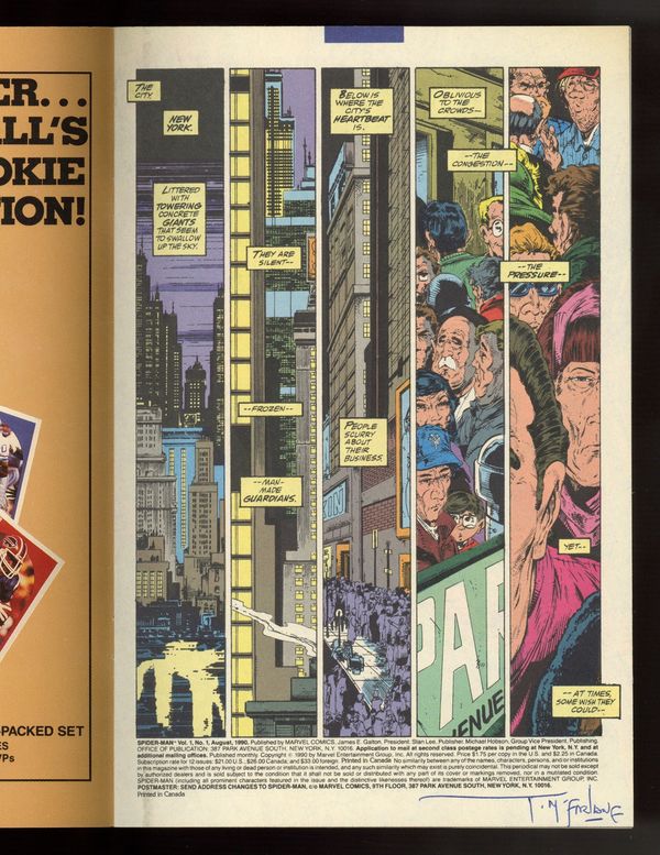 Unbagged Direct Edition - Torment Part 1 of 5. "Torment" Script and art by Todd McFarlane. Cover by Todd McFarlane. Fresh off his legendary run on the Amazing Spider-Man series, superstar artist Todd McFarlane takes the reins of his own Spider-title! Right off the bat the breathtaking action begins as mysterious and ominous drums awaken the Lethal Lizard! And send the reptilian creature on a path of death and destruction thru New York City! Spider-Man's nightmare is just starting! Appearance by Mary Jane Watson. (Notes: Spider-Man #1 was one of the first Marvel issues to feature numerous variant covers. The Spider-Man (1990) series became the fourth monthly title for the web-slinger. This issue was published the same month as Amazing Spider-Man 337. The letters page features an essay by Todd McFarlane. The webbing on the cover may be gray or purple.) 32 pages. Cover price $1.75. Grade: VF 8.0 explanation of grade Condition: Used (collectible)