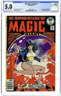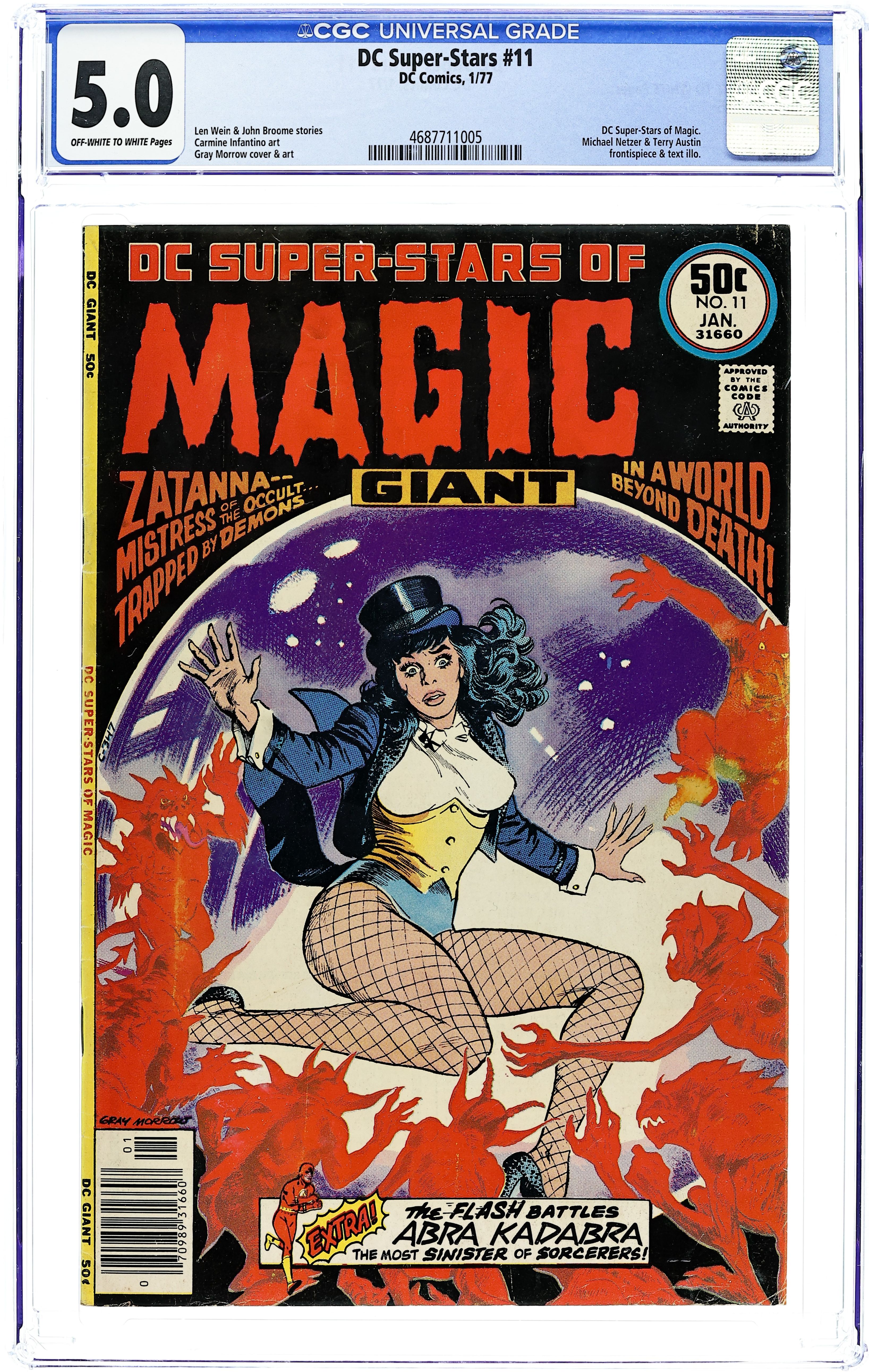 DC Super-Stars of Magic. Zatanna -- mistress of the occult -- trapped by demons in a world beyond death! Plus: The Flash battles Abra Kadabra, the most sinister of sorcerers! Featuring: 1 page DC Super-Stars of Magic story "Contents" written by Carl Gafford and drawn by Michael Netzer (as Mike Nasser) & Terry Austin; 17 page Zatanna reprint story "Zatanna the Magician" written by Len Wein and drawn by Gray Morrow; 1 page text article "The Great Houdini" written by Carl Gafford and drawn by Michael Netzer (as Mike Nasser) & Terry Austin; 1 page text article "Conjuring through the Ages" written by Carl Gafford; 13 page Flash (Barry Allen) reprint story "The Case of the Real-Gone Flash" written by John Broome and drawn by Carmine Infantino & Joe Giella; 1 page Magic Tricks You Can Do activity "The Coin in the Glass" by Carl Gafford and Vince Colletta; 1 page Magic Tricks You Can Do activity "The Disappearing Coin" by Carl Gafford and Vince Colletta; 1 page Magic Tricks You Can Do activity "The Magical Prediction" by Carl Gafford and Vince Colletta. Cover by Gray Morrow. Cover price $0.50. Grade: CGC 5.0 explanation of grade Condition: Used (collectible)