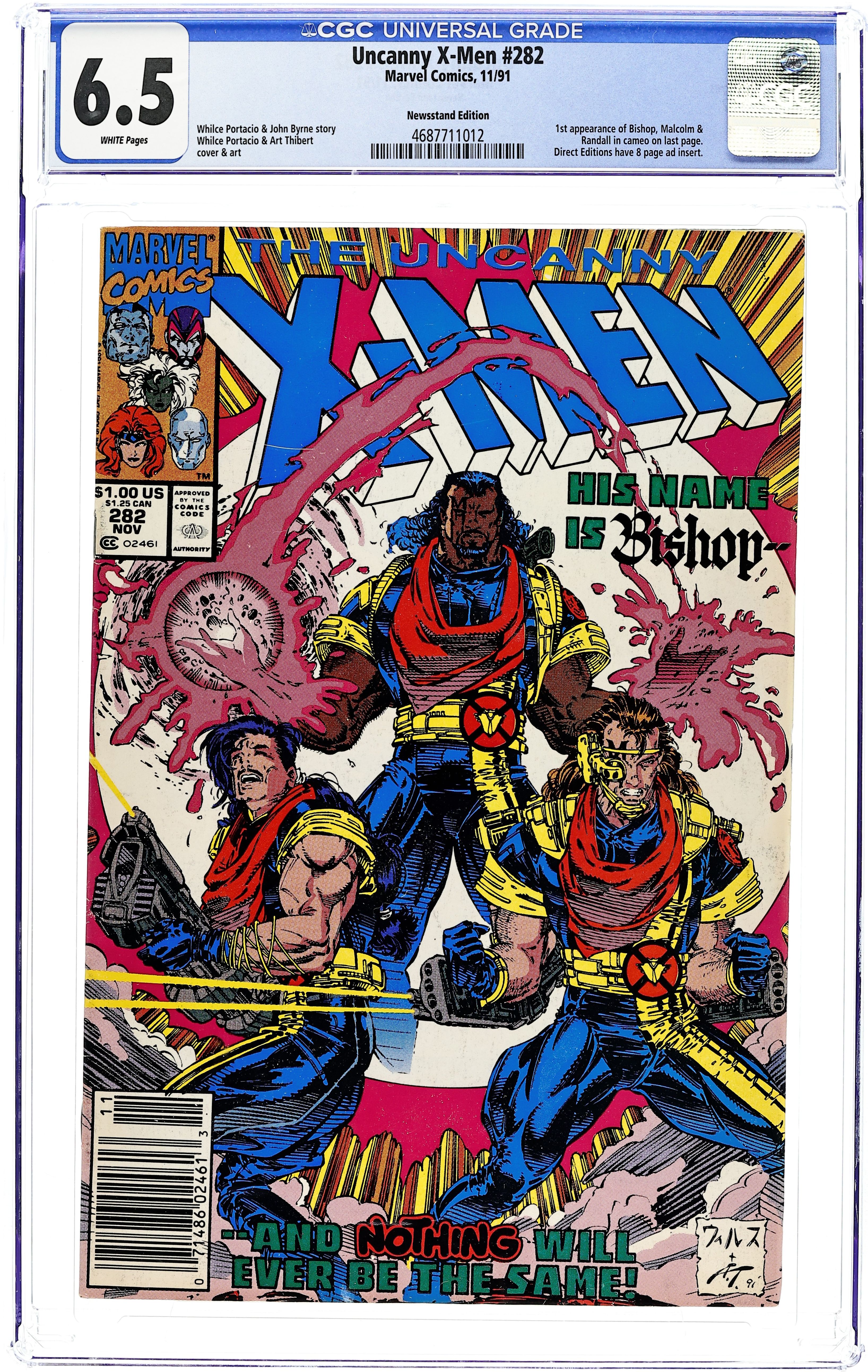 Newsstand Edition. "Payback!" Story by Whilce Portacio and John Byrne. Art by Whilce Portacio and Art Thibert. In one fell swoop the Upstarts have destroyed the Reavers and crippled the Hellfire Club. Next up, the Mutant Liberation Front. Who can stop these powerful new foes? Enter: Bishop! NOTE: 1st appearance of Bishop 40 pgs. Cover price $1.00. Grade: CGC 6.5 explanation of grade Condition: Used (collectible)