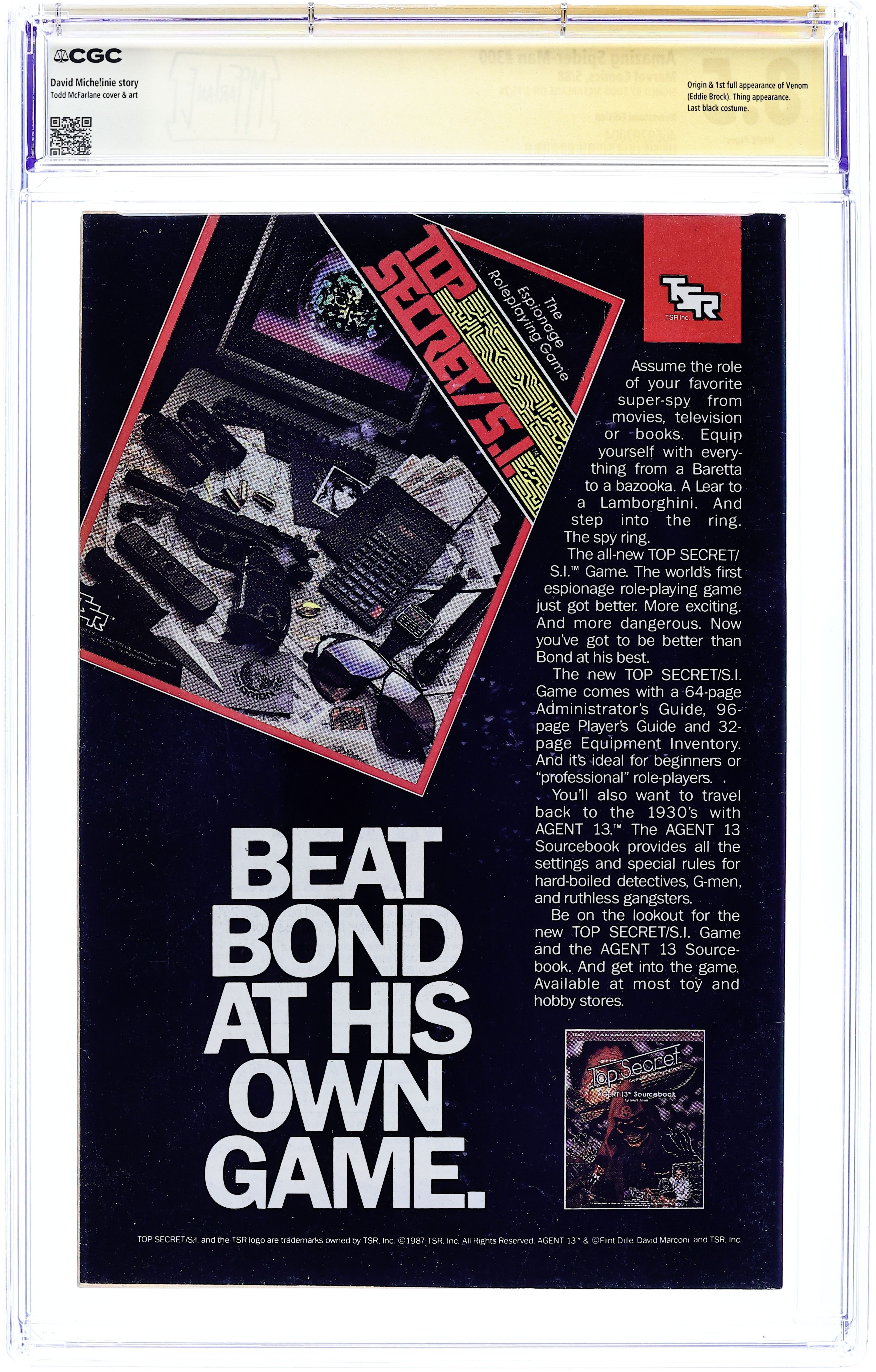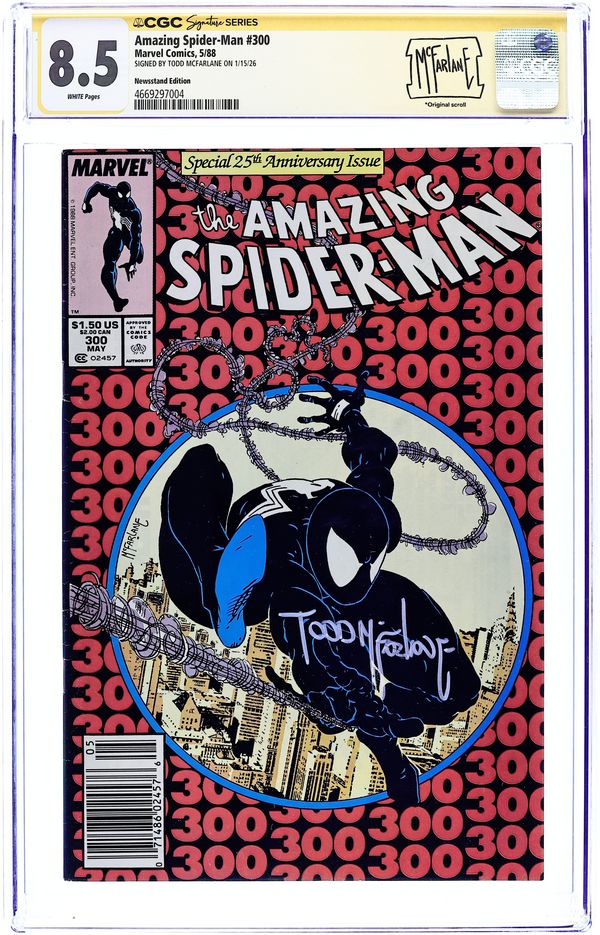 Newsstand Edition. Giant-sized 25th anniversary issue. First full appearance of Venom in "Venom!", script by David Michelinie, art by Todd McFarlane; Spidey's old alien costume has merged with reporter Eddie Brock who thinks his career was ruined by Spider-Man and the symbiote of the two, Venom, takes on the web slinger; At MJ's request, Spidey returns to the blue and red costume as she now finds his black duds way too creepy; This is the last issue in which Spider-Man appears in his black costume; Thing (of the Fantastic Four) cameo.. Stan's Soapbox Special in place of letters page: Full page editorial by Stan on the occasion of Spider-Man's 300th issue. 52 pgs., full color. Cover price $1.50. Grade: CGC 8.5 explanation of grade Condition: Used (collectible)