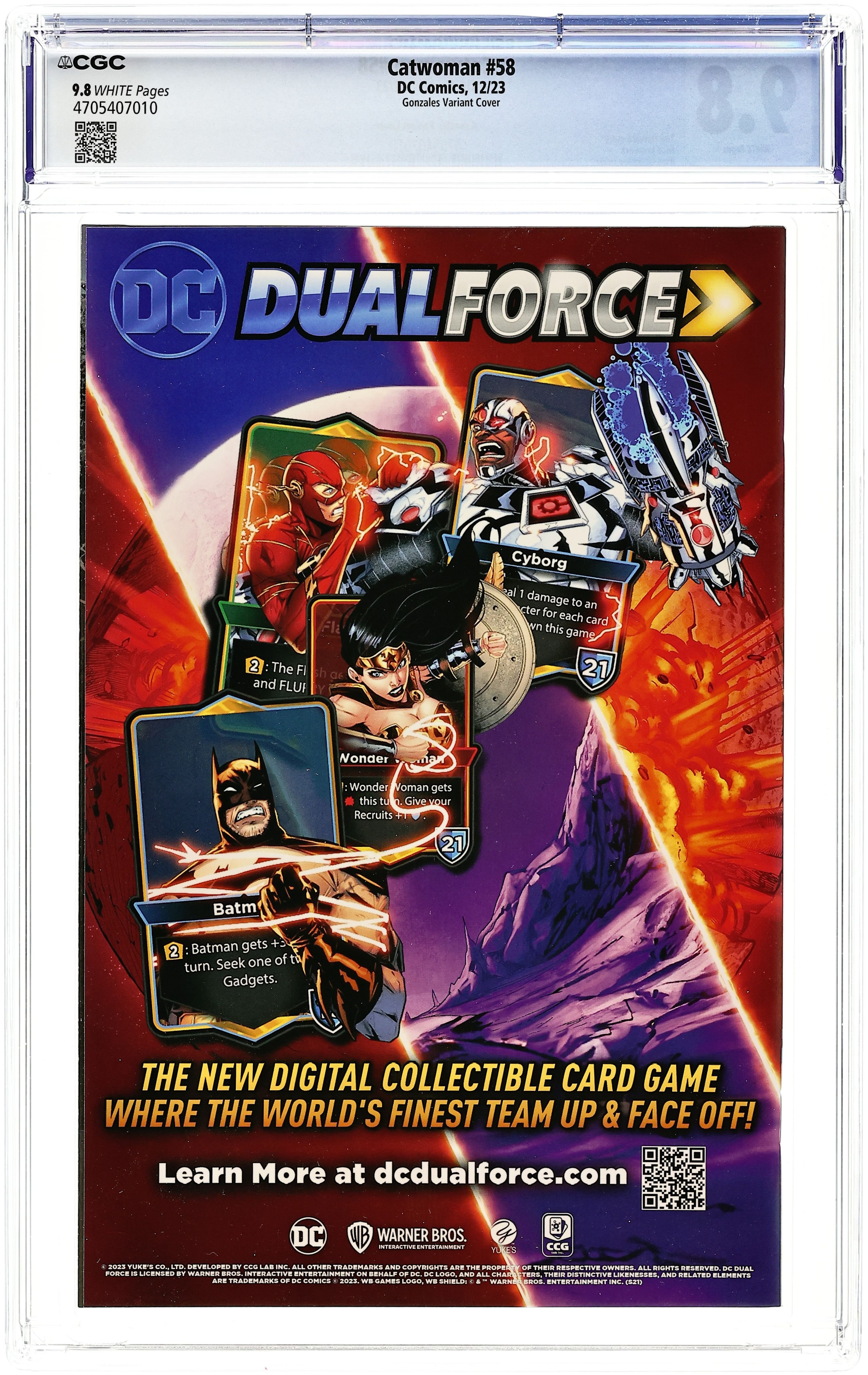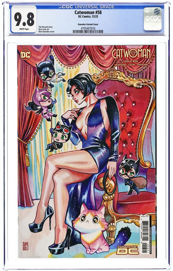 Limited 1 for 25 Retailer Incentive Variant Cover. Written by Tini Howard. Art by Nico Leon. Cover by Rian Gonzales. THE PENULTIMATE CHAPTER OF THE GOTHAM WAR! Every general puts their plans into play as Selina Kyle's cat's cradle threatens to pull the city apart. Red Hood, fundamentally changed, struggles to find his new role in this broken city. Claws fly, secrets are told, and hearts are on the line in the penultimate chapter of the Gotham War event. 32 pages, full color. Rated T+ Cover price $4.99. Grade: CGC 9.8 explanation of grade Condition: Used (collectible)