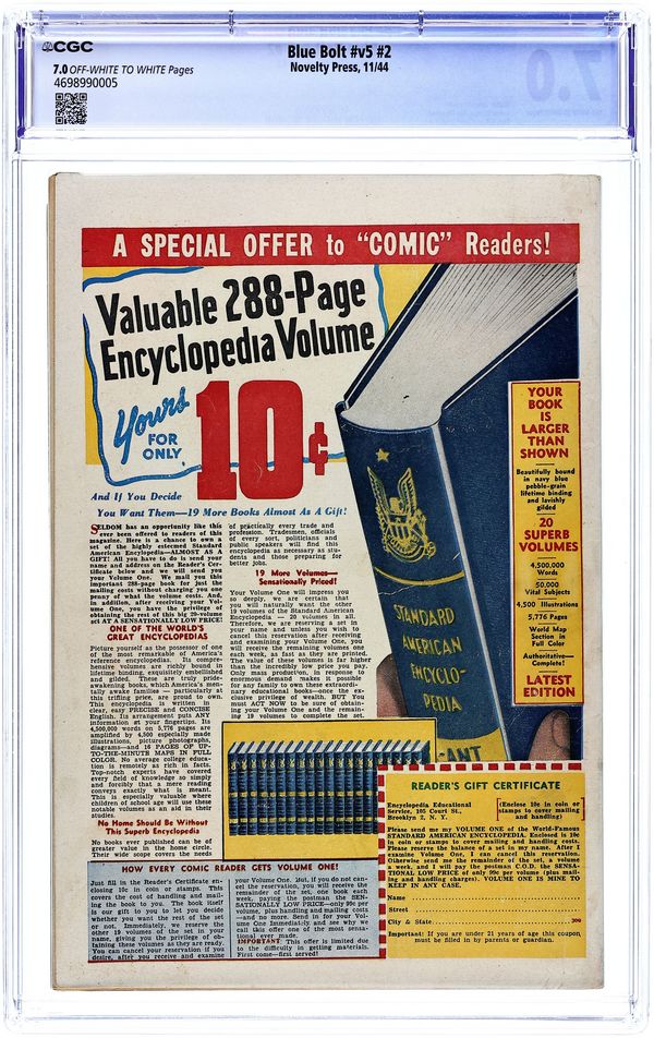 Published Nov 1944 by Funnies, Inc..Blue Bolt (1940-1949) Vol. 5 #2 CGC 7.0