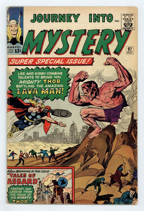 Starts May 18 Cover pencils by Jack Kirby, inks by George Roussos. First appearance of the Lava Man in "The Mighty Thor Battles the Lava Man!", script by Stan Lee, pencils by Jack Kirby, inks by Don Heck; Thor battles the Lava Man, a monster brought to the surface by Loki, who claims all the dry surface of Earth for his people; Odin forbids Thor to love Jane Foster, leading to her leaving her job as Dr. Blake's nurse. "The Traveler" text story. "The Perfect Defense!", script by Stan Lee (plot) and Larry Lieber (script), pencils by Larry Lieber, inks by George Roussos (as George Bell); In the future, Earth has conquered all planets except one, which no expedition returns from; The military thinks they have some horrific defense, but in fact they are simply so kind to the humans that arrive to conquer that they don't want to leave. "Tales of... ...Asgard! Home of the Mighty Norse Gods," script by Stan Lee, pencils by Jack Kirby, inks by George Roussos (as G. Bell); Beneath Asgard lies the Well of Life. From it came Ymir, greatest of the Frost Giants and Buri, the first Norse God who gave life to Borr. Borr had three sons. Odin was one of them. 36 pgs., full color. Cover price $0.12. Grade: GD/VG 3.0 explanation of grade Condition: Used (collectible)