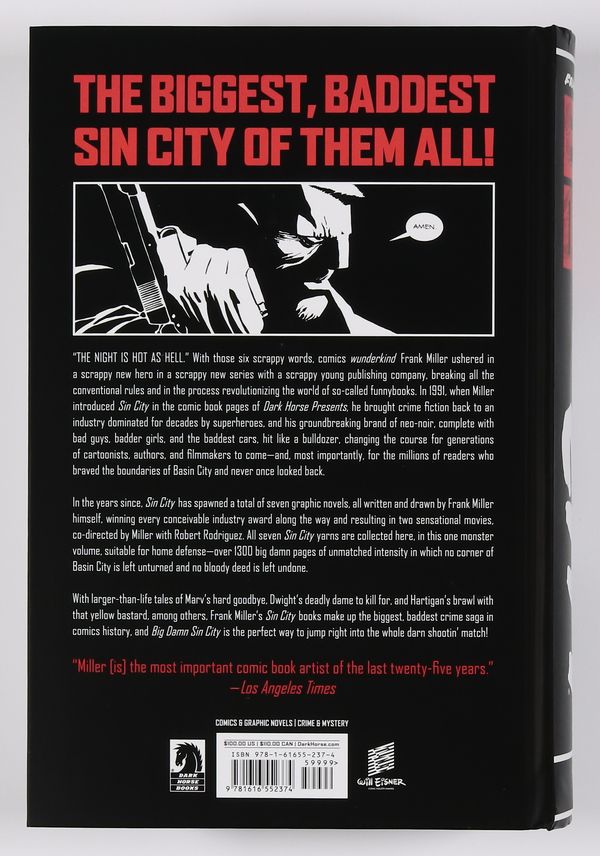 1st printing. Story and art by Frank Miller. The biggest, baddest Sin City ever is here, just in time for fall's Sin City: A Dame to Kill For! This imposing volume, suitable for home defense, contains all seven of Frank Miller's landmark Sin City yarns! In these tales of Marv, Dwight, Gail, Miho, Hartigan, Nancy, and the Yellow Bastard, no corner of Basin City is left unturned, and no bloody deed is left undone. Written with unmatched intensity and drawn in the starkest black-and-white imaginable, with blood-red bits of color, among others, the Sin City books make up the greatest crime saga in comics history, and Big Damn Sin City is the best way to rediscover the whole darn shootin' match! Hardcover, 8-in. x 12-in., 1,360 pages, PB&W/PC. Mature Readers Cover price $100.00. Grade: VF 8.0 explanation of grade Condition: Used (collectible)