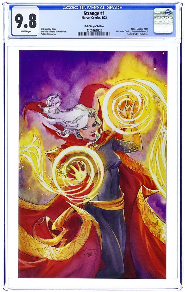 Comics Illuminati (Unknown Comics, Street Level Hero, and Comic Traders) Exclusive Virgin Cover by Sabine Rich. Written by Jed MacKay. Art by Marcelo Ferreira. A NEW SORCERER SUPREME RISES! Doctor Strange is dead! And a new Sorcerer Supreme has taken the title, or should we say Sorceress? Haunted by her recently returned memories, Clea longs to bring Stephen Strange back from the dead! But when a mysterious group attacks the magical realm, Clea must rise to the duties of Sorcerer Supreme. For she is now the sole protector of Earth against magical threats. Don't miss the twists and turns as Jed MacKay continues the story from DEATH OF DOCTOR STRANGE with artist Marcelo Ferreira (THE AMAZING SPIDER-MAN)! 36 pages, full color. Rated T+ Cover price $4.99. Grade: CGC 9.8 explanation of grade Condition: Used (collectible)