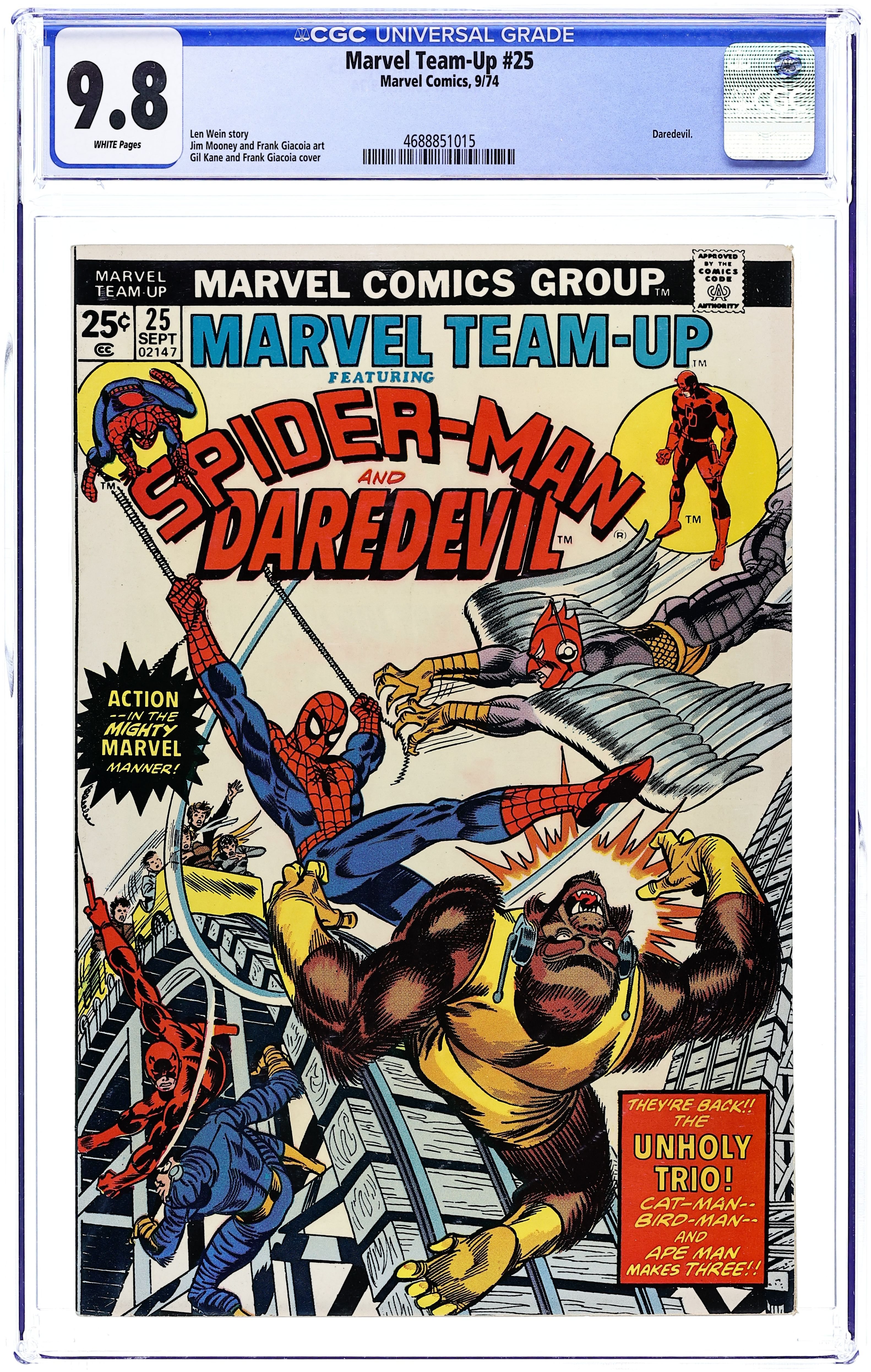 "Three Into Two Won't Go!" Guest-starring Spider-Man and Daredevil. Script by Len Wein. Pencils by Jim Mooney. Inks by Frank Giacoia. Cover by Gil Kane and Frank Giacoia. Daredevil and Spider-man mix it up with Ape-Man, Bird-Man, and Cat-Man at Coney Island, while the life of a young lady hangs in the balance! (Note: The letters page contains Marvel Value Stamp Series A #87 J. Jonah Jameson.) 36 pages Cover price $0.25. Grade: CGC 9.8 explanation of grade Condition: Used (collectible)