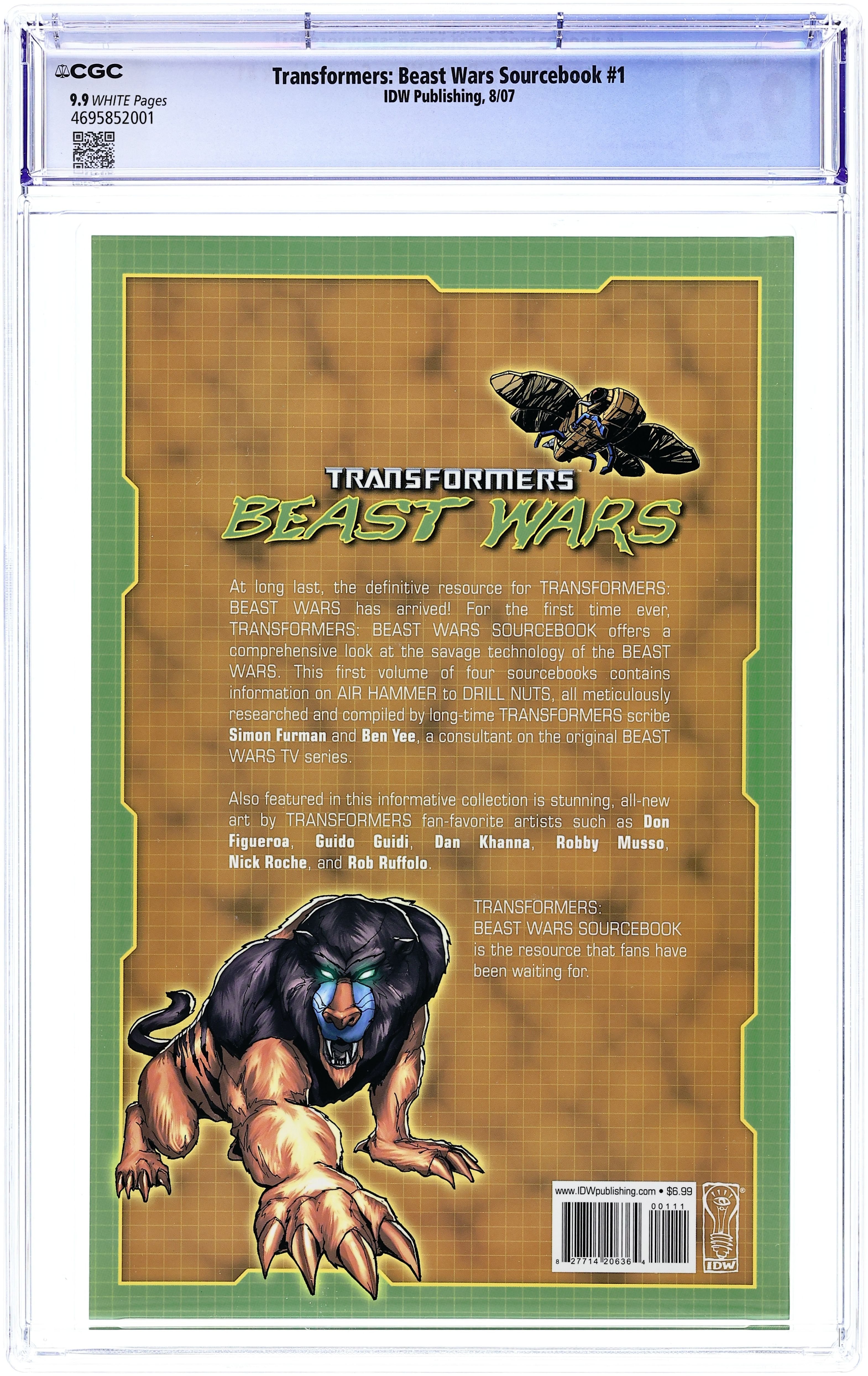 Simon Furman & Ben Yee (w); Various (a); Don Figueroa (c) Simon Furman (Transformers: Beast Wars: The Gathering) and Ben Yee (consultant on the Beast Wars TV series) team up to present an all-encompassing, unifying resource book highlighting the characters, worlds and technology from all generations and incarnations of BEAST WARS. From AIR HAMMER to WOLFANG and beyond, and featuring all-new art from a host of the greatest TRANSFORMERS artists like Don Figueroa, Nick Roche, Rob Ruffolo, and many more, this is the series everyone's been clamoring for! This special series will be comprised of three 48-page, ad-free editions. Cover price $6.99. Grade: CGC 9.9 explanation of grade Condition: Used (collectible)