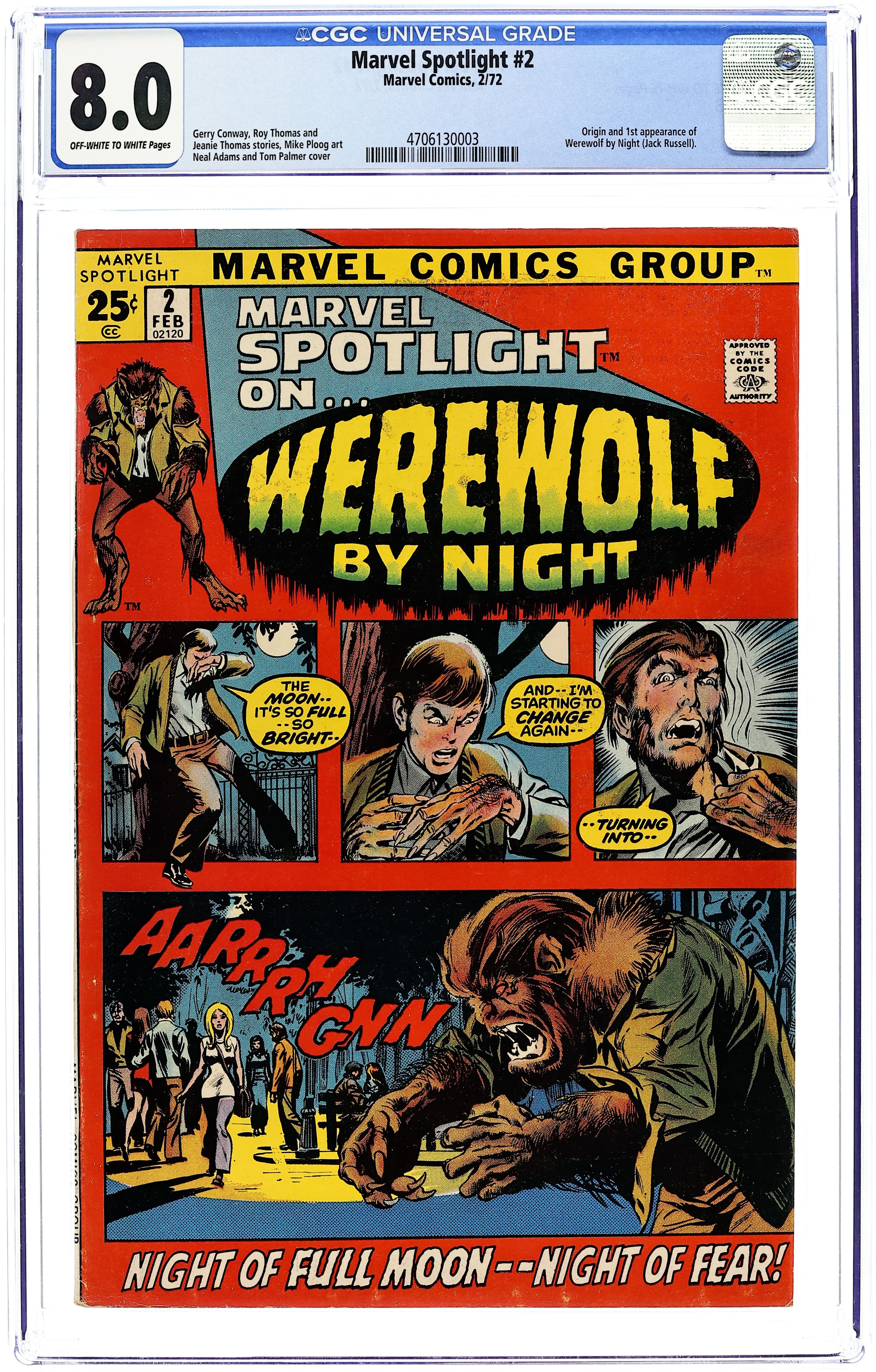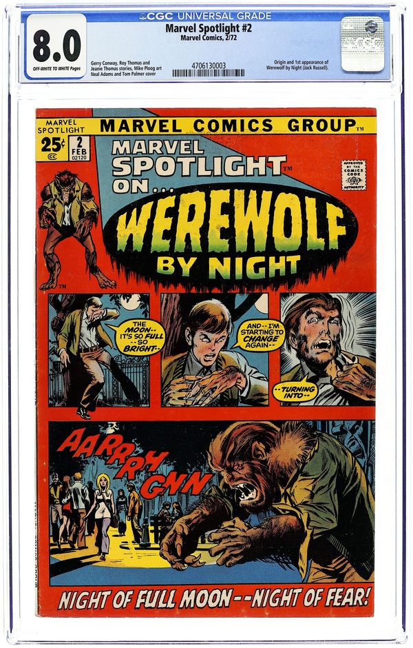 52-page giant. Origin and first appearance of Werewolf By Night. Cover pencils by Neal Adams, inks by Tom Palmer. First Night, script by Roy Thomas (plot); Jean Thomas (plot), and Gerry Conway (script), art by Mike Ploog; Jack learns of the family curse on his eighteenth birthday from his mother on her deathbead; Jack begins to believe that his step-father had his mother killed. House ad for Venus, art by Bill Everett. Where Gargoyles Dwell! starring Venus, script and art by Bill Everett. 52 pages, full color. Cover price $0.25. Grade: CGC 8.0 explanation of grade Condition: Used (collectible)