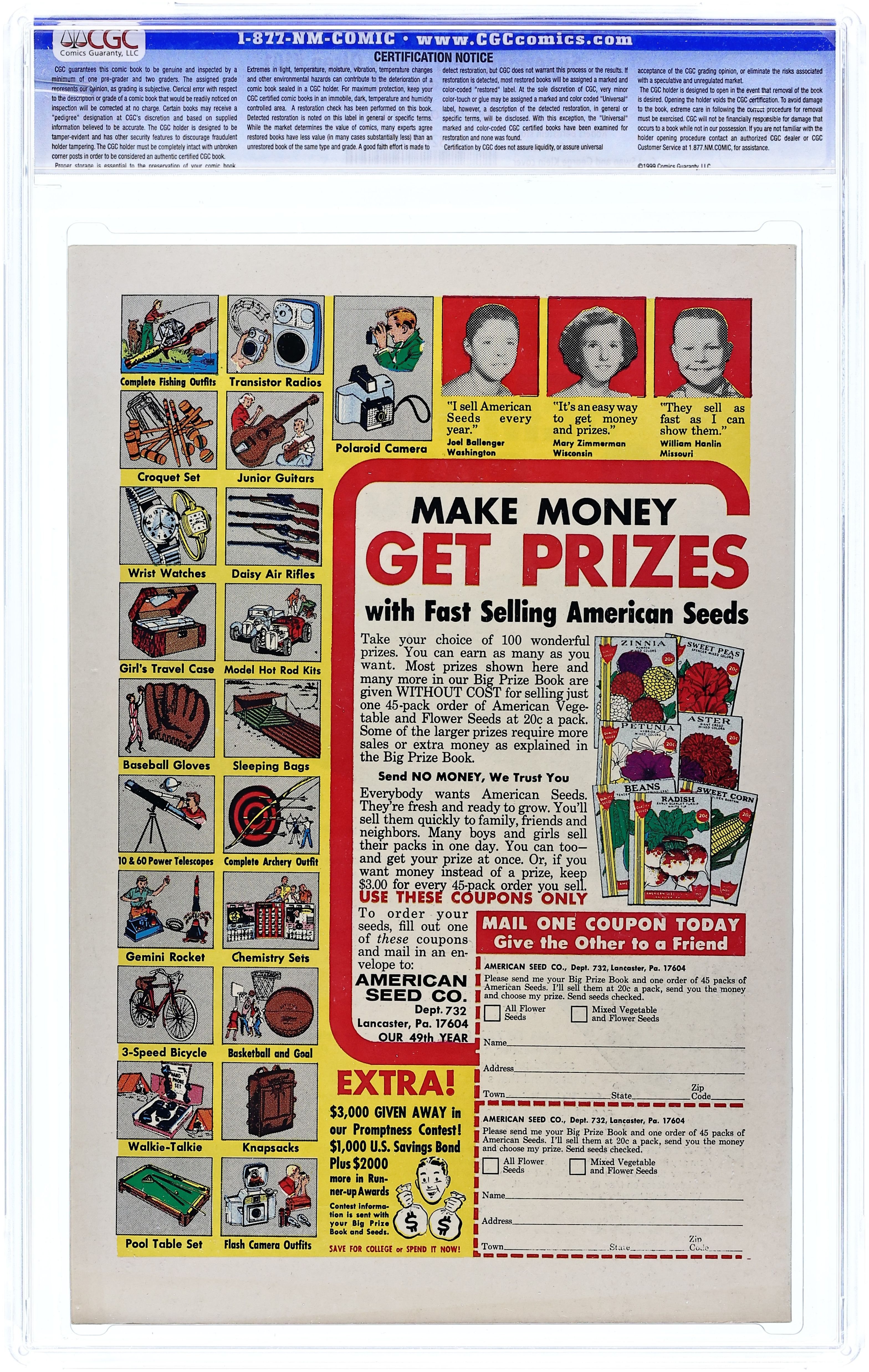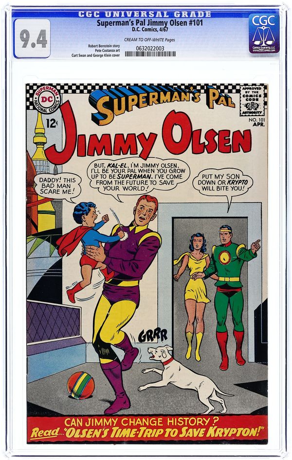 Cover pencils by Curt Swan, inks by George Klein. Olsen's Time-Trip to Save Krypton!, script by Robert Bernstein, art by Pete Costanza; Jimmy travels to the past to try and save Krypton. Krypton's Last Chance! [Olsen's Time-Trip to Save Krypton!], script by Robert Bernstein, art by Pete Costanza. Billy humor half-pager by Henry Boltinoff. 36 Pages, Full Color. Cover price $0.12. Grade: CGC 9.4 explanation of grade Condition: Used (collectible)