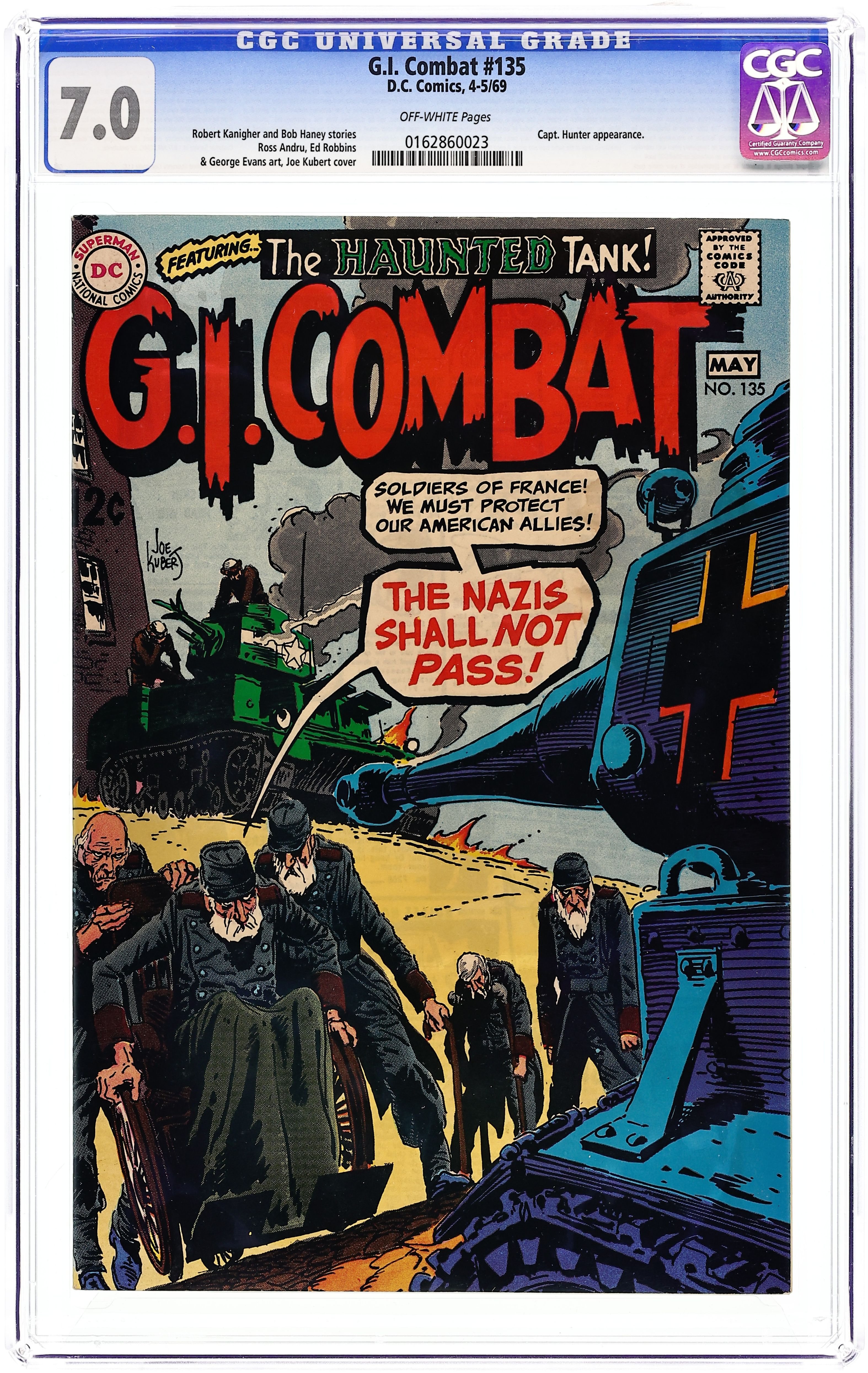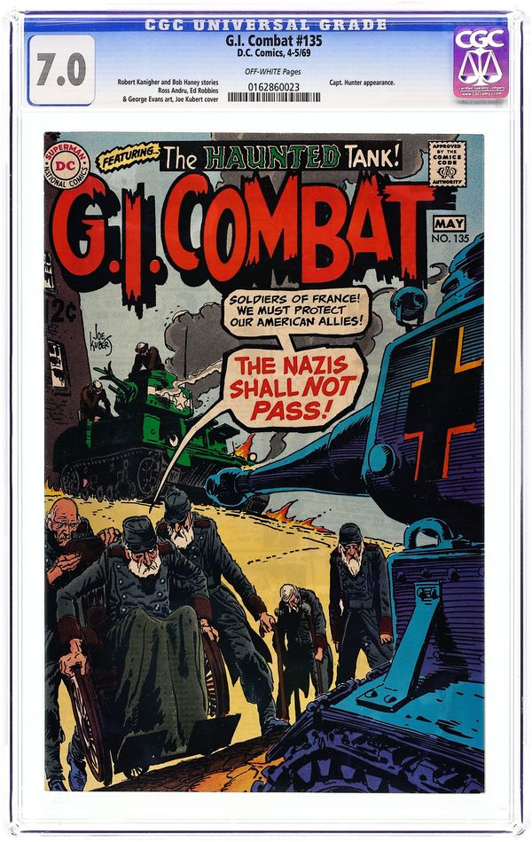 Cover by Joe Kubert. Written by Robert Kanigher and unknown. Art by Ross Andru, Ed Robbins, George Evans and Mike Esposito. The soldiers of France must protect their American allies! The Nazis shall not pass in the Haunted Tank story "Death is the Joker" by Robert Kanigher, Ross Andru and Mike Esposito. Plus: "Kill the Green Beret," with art by Ed Robbins. And: "The Hound and the Hare," with art by George Evans. 36 Pages, Full Color. Cover price $0.12. Grade: CGC 7.0 explanation of grade Condition: Used (collectible)